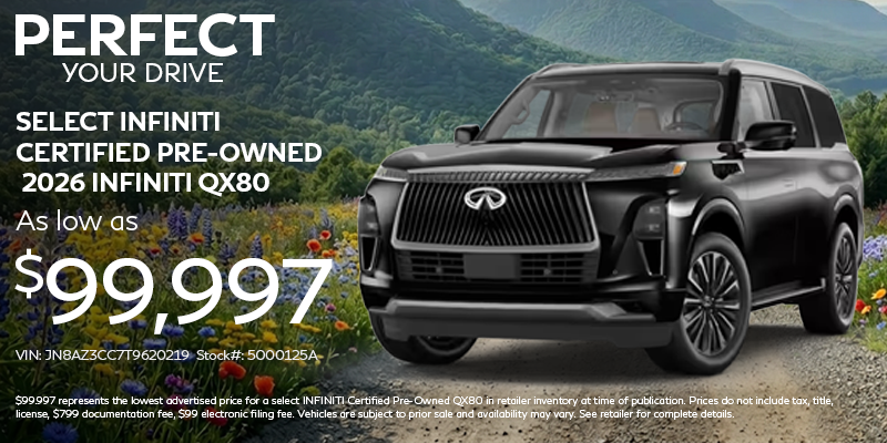 $99,997 represents the lowest advertised price for a select INFINITI Certified Pre-Owned QX80 in retailer inventory at time of publication. Prices do not include tax, title, license, $799 documentation fee, $99 electronic filing fee. Vehicles are subject to prior sale and availability may vary. See retailer for complete details.