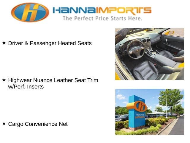 Why shop with Hanna Imports? We specialize in hand-selecting top-quality used cars, trucks, and SUVs for drivers across Raleigh, Durham, Cary, Chapel Hill, and the greater Triangle area of North Carolina. Our massive selection of 1,000+ vehicles on our Raleigh lot is carefully curated to include the most sought-after models, all priced below market value. We believe in transparency and efficiency—our vehicles are aggressively priced from the start, which means no haggling, no hassle, and no wasted time. The price you see is our absolute best price. Whether you're coming from Wake Forest, Apex, Garner, or anywhere in central NC, we’re committed to making your car-buying experience smooth, affordable, and enjoyable. Come see why Hanna Imports is one of the most trusted used car dealerships in North Carolina! Used Chevrolet Corvette in Raleigh. Used Chevrolet Corvette in North Carolina, Memory Package, Preferred Equipment Group 3LT (6-Way Power Front Passenger Seat Adjuster, Cargo Convenience Net, Driver & Passenger Frontal & Side Impact Airbags, Driver & Passenger Heated Seats, ETR AM/FM Stereo w/6-Disc In-Dash CD Changer/MP3, Head-Up Display, Highwear Nuance Leather Seat Trim w/Perf. Inserts, Inside Rear-View Mirror, Manual Tilt/Power Telescoping Steering Column, Universal Home Remote, Compass, and Outside Auto-Dimming Rear-View Mirror), 2D Convertible, ETR AM/FM Stereo w/CD/MP3/Navigation, Power Folding Convertible Top, 18 x 8.5 Front & 19 x 10.0 Rear Pntd. Aluminum Wheels, 18 x 8.5 Front 19 x 10 Rear Chrome Aluminum Wheels, 4-Wheel Disc Brakes, 7 Speakers, 7-Speaker Sound System Feature, ABS brakes, Air Conditioning, Alloy wheels, AM/FM radio, Automatic temperature control, Bumpers: body-color, CD player, Convertible roof lining, Delay-off headlights, Driver door bin, Driver vanity mirror, Dual front impact airbags, Dual front side impact airbags, Electronic Stability Control, Four wheel independent suspension, Front anti-roll bar, Front Bucket Seats, Front Center Armrest, Front dual zone A/C, Front fog lights, Front License Plate Bracket, Front reading lights, Front Sport Bucket Seats, Fully automatic headlights, Glass rear window, Heated door mirrors, High-Intensity Discharge Headlights, Highwear Nuance Perforated Leather Seat Trim, Illuminated entry, Leather Shift Knob, Leather steering wheel, Low tire pressure warning, Magnetic Selective Ride Control, Occupant sensing airbag, OnStar 1-Year Safe & Sound Service, Outside temperature display, Panic alarm, Passenger door bin, Passenger vanity mirror, Power door mirrors, Power driver seat, Power passenger seat, Power steering, Power windows, Radio data system, Rear anti-roll bar, Rear window defroster, Remote keyless entry, Security system, Speed control, Speed-sensing steering, Sport steering wheel, Tachometer, Tilt steering wheel, Traction control, Trip computer, Variably intermittent wipers, Voltmeter, and Weather band radio.