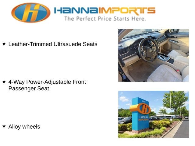Why shop with Hanna Imports? We specialize in hand-selecting top-quality used cars, trucks, and SUVs for drivers across Raleigh, Durham, Cary, Chapel Hill, and the greater Triangle area of North Carolina. Our massive selection of 1,000+ vehicles on our Raleigh lot is carefully curated to include the most sought-after models, all priced below market value. We believe in transparency and efficiency—our vehicles are aggressively priced from the start, which means no haggling, no hassle, and no wasted time. The price you see is our absolute best price. Whether you're coming from Wake Forest, Apex, Garner, or anywhere in central NC, we’re committed to making your car-buying experience smooth, affordable, and enjoyable. Come see why Hanna Imports is one of the most trusted used car dealerships in North Carolina! Used Toyota Camry Hybrid in Raleigh. Used Toyota Camry Hybrid in North Carolina, Convenience Package (Alarm & Immobilizer Anti-Theft System, HomeLink Universal Transceiver, and Integrated Back-Up Camera w/Static Line), Leather Package (4-Way Power-Adjustable Front Passenger Seat, Leather Door Trim, Leather-Trimmed Ultrasuede Seats, and Multi-Stage Heated Driver & Passenger Seats), Camry Hybrid XLE, 2.5L I4 Hybrid DOHC, ABS brakes, Alloy wheels, Compass, Electronic Stability Control, Front dual zone A/C, Heated door mirrors, Illuminated entry, Low tire pressure warning, Remote keyless entry, Traction control, 4-Wheel Disc Brakes, 6 Speakers, 7.0J x 17 Alloy Wheels, Air Conditioning, AM/FM radio, Auto-dimming Rear-View mirror, Automatic temperature control, Brake assist, Bumpers: body-color, CD player, Delay-off headlights, Driver door bin, Driver vanity mirror, Dual front impact airbags, Dual front side impact airbags, Fabric Seat Trim, Four wheel independent suspension, Front anti-roll bar, Front Bucket Seats, Front Center Armrest, Front fog lights, Front reading lights, Fully automatic headlights, Knee airbag, Leather Shift Knob, Leather steering wheel, Occupant sensing airbag, Outside temperature display, Overhead airbag, Overhead console, Panic alarm, Passenger door bin, Passenger vanity mirror, Power door mirrors, Power driver seat, Power steering, Power windows, Radio: AM/FM/CD Player w/6.1 Touch Screen, Rear anti-roll bar, Rear seat center armrest, Rear side impact airbag, Rear window defroster, Speed control, Speed-sensing steering, Split folding rear seat, Steering wheel mounted audio controls, Telescoping steering wheel, Tilt steering wheel, Trip computer, and Variably intermittent wipers.