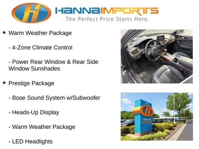 Why shop with Hanna Imports? We specialize in hand-selecting top-quality used cars, trucks, and SUVs for drivers across Raleigh, Durham, Cary, Chapel Hill, and the greater Triangle area of North Carolina. Our massive selection of 1,000+ vehicles on our Raleigh lot is carefully curated to include the most sought-after models, all priced below market value. We believe in transparency and efficiency—our vehicles are aggressively priced from the start, which means no haggling, no hassle, and no wasted time. The price you see is our absolute best price. Whether you're coming from Wake Forest, Apex, Garner, or anywhere in central NC, we’re committed to making your car-buying experience smooth, affordable, and enjoyable. Come see why Hanna Imports is one of the most trusted used car dealerships in North Carolina! Used Audi A6 in Raleigh. Used Audi A6 in North Carolina, 19 Sport Package (Sport Suspension and Wheels: 8.5J x 19 5-Double-Spoke-Design), Cold Weather Package (Heated Rear Seats and Heated Steering Wheel), Prestige Package (Bose Sound System w/Subwoofer, Front Seat Ventilation, Heads-Up Display, LED Headlights, LED Interior Lighting, and Power Adjustable Steering Column w/Memory), Warm Weather Package (Power Rear Window & Rear Side Window Sunshades and 4-Zone Climate Control), A6 3.0T Prestige quattro, quattro, Black Leather, Exterior Parking Camera Rear, Navigation System, Power moonroof, 10 Speakers, 4-Wheel Disc Brakes, ABS brakes, Air Conditioning, Alloy wheels, AM/FM radio: SiriusXM, Anti-whiplash front head restraints, Audi Guard All-Weather Floor Mats (Set of 4), Audi Guard Cargo Mat, Auto-dimming door mirrors, Auto-dimming Rear-View mirror, Automatic temperature control, Brake assist, Bumpers: body-color, Cargo Net, CD player, Compass, Delay-off headlights, Driver door bin, Driver vanity mirror, Dual front impact airbags, Dual front side impact airbags, DVD-Audio, Electronic Stability Control, Four wheel independent suspension, Front anti-roll bar, Front Bucket Seats, Front Center Armrest w/Storage, Front dual zone A/C, Front fog lights, Front reading lights, Garage door transmitter: HomeLink, Genuine wood console insert, Genuine wood dashboard insert, Genuine wood door panel insert, Heated Comfort Front Seats, Heated door mirrors, Heated front seats, High intensity discharge headlights: Xenon plus, HVAC memory, Illuminated entry, Knee airbag, Leather Seating Surfaces, Leather steering wheel, Low tire pressure warning, Memory seat, Occupant sensing airbag, Outside temperature display, Overhead airbag, Panic alarm, Passenger door bin, Passenger vanity mirror, Power door mirrors, Power driver seat, Power passenger seat, Power steering, Power windows, Radio data system, Radio: Multi Media Interface (MMI) Navigation Plus, Rain sensing wipers, Rear air conditioning, Rear anti-roll bar, Rear fog lights, Rear reading lights, Rear seat center armrest, Rear window defroster, Remote keyless entry, Security system, Speed control, Speed-sensing steering, Speed-Sensitive Wipers, Split folding rear seat, Steering wheel mounted audio controls, Tachometer, Telescoping steering wheel, Tilt steering wheel, Traction control, Trip computer, Turn signal indicator mirrors, Variably intermittent wipers, and Wheels: 8.0J x 18 5-V-Spoke Design.