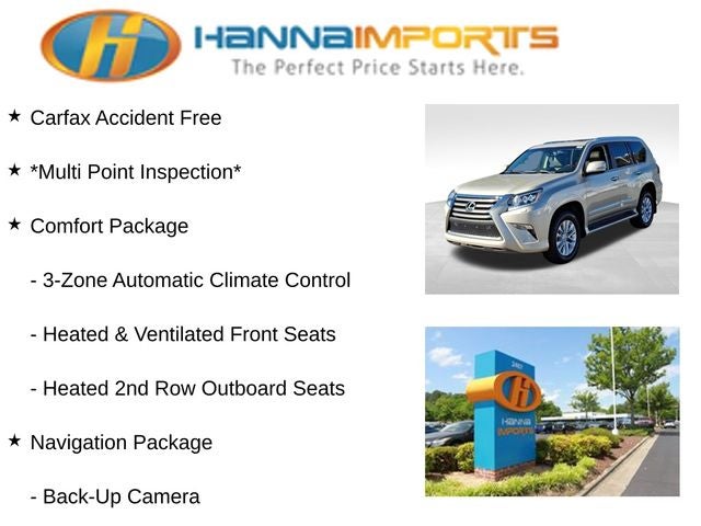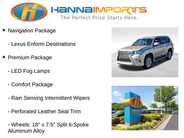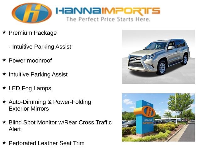 Why shop with Hanna Imports? We specialize in hand-selecting top-quality used cars, trucks, and SUVs for drivers across Raleigh, Durham, Cary, Chapel Hill, and the greater Triangle area of North Carolina. Our massive selection of 1,000+ vehicles on our Raleigh lot is carefully curated to include the most sought-after models, all priced below market value. We believe in transparency and efficiency—our vehicles are aggressively priced from the start, which means no haggling, no hassle, and no wasted time. The price you see is our absolute best price. Whether you're coming from Wake Forest, Apex, Garner, or anywhere in central NC, we’re committed to making your car-buying experience smooth, affordable, and enjoyable. Come see why Hanna Imports is one of the most trusted used car dealerships in North Carolina! Used Lexus GX in Raleigh. Used Lexus GX in North Carolina, Comfort Package, Navigation Package, Premium Package (Intuitive Parking Assist, LED Fog Lamps, Perforated Leather Seat Trim, Rain Sensing Intermittent Wipers, and Wheels: 18 x 7.5 Split 6-Spoke Aluminum Alloy), 4WD, Auto-Dimming & Power-Folding Exterior Mirrors, Blind Spot Monitor w/Rear Cross Traffic Alert, Power moonroof, 18 x 7.5 6-Spoke Aluminum Alloy Wheels, 3.909 Axle Ratio, 3rd row seats: split-bench, 4-Wheel Disc Brakes, 9 Speakers, ABS brakes, Air Conditioning, Alloy wheels, AM/FM radio: SiriusXM, Anti-whiplash front head restraints, Auto tilt-away steering wheel, Auto-dimming Rear-View mirror, Automatic temperature control, Bodyside moldings, Brake assist, Bumpers: body-color, CD player, Compass, Delay-off headlights, Driver door bin, Driver vanity mirror, Driver's Seat Mounted Armrest, Dual front impact airbags, Dual front side impact airbags, Electronic Stability Control, Emergency communication system: Safety Connect, Exterior Parking Camera Rear, Front anti-roll bar, Front Bucket Seats, Front dual zone A/C, Front reading lights, Front wheel independent suspension, Fully automatic headlights, Garage door transmitter: HomeLink, Heated door mirrors, Illuminated entry, Illuminated running boards, Knee airbag, Leather Shift Knob, Leather steering wheel, Low tire pressure warning, Memory seat, NuLuxe Seat Trim, Occupant sensing airbag, Outside temperature display, Overhead airbag, Overhead console, Panic alarm, Passenger door bin, Passenger seat mounted armrest, Passenger vanity mirror, Power door mirrors, Power driver seat, Power passenger seat, Power steering, Power windows, Radio data system, Radio: AM/FM Lexus Premium Audio, Rear anti-roll bar, Rear reading lights, Rear seat center armrest, Rear side impact airbag, Rear window defroster, Rear window wiper, Remote keyless entry, Roof rack: rails only, Security system, Speed control, Speed-sensing steering, Split folding rear seat, Spoiler, Steering wheel memory, Steering wheel mounted audio controls, Tachometer, Telescoping steering wheel, Tilt steering wheel, Traction control, Trip computer, Turn signal indicator mirrors, and Variably intermittent wipers.