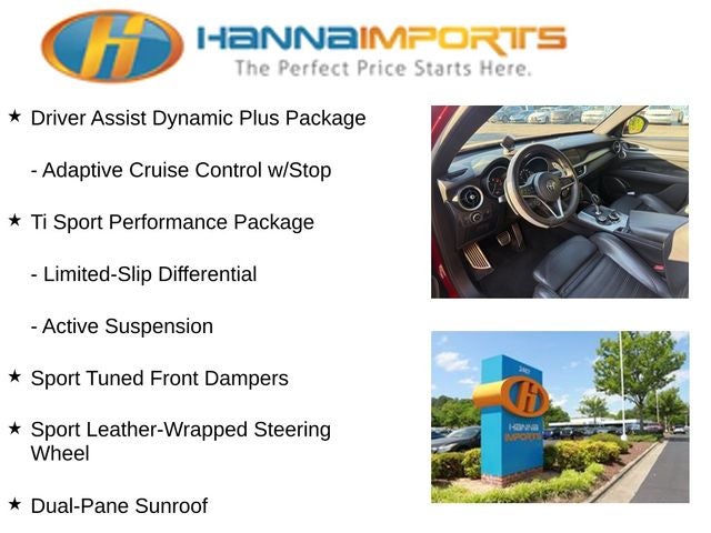 Why shop with Hanna Imports? We specialize in hand-selecting top-quality used cars, trucks, and SUVs for drivers across Raleigh, Durham, Cary, Chapel Hill, and the greater Triangle area of North Carolina. Our massive selection of 1,000+ vehicles on our Raleigh lot is carefully curated to include the most sought-after models, all priced below market value. We believe in transparency and efficiency—our vehicles are aggressively priced from the start, which means no haggling, no hassle, and no wasted time. The price you see is our absolute best price. Whether you're coming from Wake Forest, Apex, Garner, or anywhere in central NC, we’re committed to making your car-buying experience smooth, affordable, and enjoyable. Come see why Hanna Imports is one of the most trusted used car dealerships in North Carolina! Used Alfa Romeo Stelvio in Raleigh. Used Alfa Romeo Stelvio in North Carolina, Convenience Package (115V Auxiliary Power Outlet, Cargo Comp Adjustable Rail System, and Cargo Net), Driver Assist Dynamic Plus Package (Adaptive Cruise Control w/Stop, Auto High Beam Headlamp Control, Forward Collision Warning, Infrared Windshield, and Lane Departure Warning System), Driver Assistance Static Package (Auto-Dimming Exterior Mirrors and Blind Spot & Cross Path Detection), Quick Order Package 22S Ti Sport (Aluminum Interior Trim, Aluminum Steering Column Mounted Paddle Shifters, Black Roof Rails, Colored Brake Calipers, Gloss Black Window Surround Moldings, Power Adjustable Bolster, Sport Leather Seats, Sport Leather-Wrapped Steering Wheel, Sport Tuned Front Dampers, and Wheels: 20 x 8.5 Sport Aluminum), Ti Sport Performance Package (Active Suspension and Limited-Slip Differential), Stelvio Ti, AWD, Dual-Pane Sunroof, ParkView Rear Back-Up Camera, Power Liftgate, 3.73 Axle Ratio, 4-Wheel Disc Brakes, 8 Speakers, 8.8 Widescreen Color Display, ABS brakes, Air Conditioning, Alloy wheels, AM/FM radio: SiriusXM, Apple CarPlay, Auto-dimming Rear-View mirror, Automatic temperature control, Brake assist, Bumpers: body-color, Cargo Comp Adjustable Rail System (DISC), Cargo Net (DISC), Compass, Delay-off headlights, Driver door bin, Driver vanity mirror, Dual front impact airbags, Dual front side impact airbags, Electronic Stability Control, Four wheel independent suspension, Front anti-roll bar, Front Bucket Seats, Front Center Armrest, Front dual zone A/C, Front reading lights, Fully automatic headlights, Garage door transmitter, Genuine wood console insert, Genuine wood dashboard insert, Genuine wood door panel insert, Gloss Yellow Calipers w/White Script, Google Android Auto, harman/kardon Premium Audio, HD Radio, Heated door mirrors, Heated front seats, Heated steering wheel, High intensity discharge headlights: Bi-Xenon, Illuminated entry, Knee airbag, Leather Seats, Leather Shift Knob, Low tire pressure warning, Memory seat, Occupant sensing airbag, Outside temperature display, Overhead airbag, Overhead c
