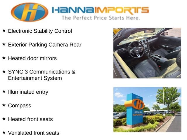 Why shop with Hanna Imports? We specialize in hand-selecting top-quality used cars, trucks, and SUVs for drivers across Raleigh, Durham, Cary, Chapel Hill, and the greater Triangle area of North Carolina. Our massive selection of 1,000+ vehicles on our Raleigh lot is carefully curated to include the most sought-after models, all priced below market value. We believe in transparency and efficiency—our vehicles are aggressively priced from the start, which means no haggling, no hassle, and no wasted time. The price you see is our absolute best price. Whether you're coming from Wake Forest, Apex, Garner, or anywhere in central NC, we’re committed to making your car-buying experience smooth, affordable, and enjoyable. Come see why Hanna Imports is one of the most trusted used car dealerships in North Carolina! Used Ford Mustang in Raleigh. Used Ford Mustang in North Carolina, Equipment Group 200A, 2D Convertible, ABS brakes, Alloy wheels, Compass, Electronic Stability Control, Exterior Parking Camera Rear, Front dual zone A/C, Heated door mirrors, Heated front seats, Illuminated entry, Low tire pressure warning, Remote keyless entry, SYNC 3 Communications & Entertainment System, Traction control, Ventilated front seats, 4-Wheel Disc Brakes, 9 Speakers, Air Conditioning, AM/FM radio: SiriusXM, AM/FM Stereo w/Single CD Player, Apple CarPlay/Android Auto, Auto-dimming Rear-View mirror, Automatic temperature control, Brake assist, Bumpers: body-color, CD player, Climate Controlled Heated/Cooled Front Seats, Convertible roof lining, Delay-off headlights, Driver door bin, Driver vanity mirror, Dual front impact airbags, Dual front side impact airbags, Emergency communication system: 911 Assist, Four wheel independent suspension, Front anti-roll bar, Front Bucket Seats, Front Center Armrest, Front fog lights, Front reading lights, Fully automatic headlights, Garage door transmitter, Glass rear window, Knee airbag, Leather Bucket Seats, Leather Shift Knob, Occupant sensing airbag, Outside temperature display, Overhead console, Panic alarm, Passenger door bin, Passenger vanity mirror, Power convertible roof, Power door mirrors, Power driver seat, Power passenger seat, Power steering, Power windows, Radio data system, Rear anti-roll bar, Rear window defroster, Security system, SiriusXM Radio, Speed control, Speed-sensing steering, Speed-Sensitive Wipers, Spoiler, Steering wheel mounted audio controls, Tachometer, Telescoping steering wheel, Tilt steering wheel, Trip computer, Turn signal indicator mirrors, Variably intermittent wipers, Voltmeter, and Wheels: 18 x 8 Machined-Face Aluminum.