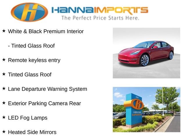 Why shop with Hanna Imports? We specialize in hand-selecting top-quality used cars, trucks, and SUVs for drivers across Raleigh, Durham, Cary, Chapel Hill, and the greater Triangle area of North Carolina. Our massive selection of 1,000+ vehicles on our Raleigh lot is carefully curated to include the most sought-after models, all priced below market value. We believe in transparency and efficiency—our vehicles are aggressively priced from the start, which means no haggling, no hassle, and no wasted time. The price you see is our absolute best price. Whether you're coming from Wake Forest, Apex, Garner, or anywhere in central NC, we’re committed to making your car-buying experience smooth, affordable, and enjoyable. Come see why Hanna Imports is one of the most trusted used car dealerships in North Carolina! Used Tesla Model 3 in Raleigh. Used Tesla Model 3 in North Carolina, White & Black Premium Interior (Center Console, Heated Side Mirrors, LED Fog Lamps, and Tinted Glass Roof), Model 3 Long Range, AWD, Exterior Parking Camera Rear, Heated Front Bucket Seats, Lane Departure Warning System, Navigation System, Remote keyless entry, 15 Speakers, 4-Wheel Disc Brakes, ABS brakes, Air Conditioning, Alloy wheels, Auto High-beam Headlights, Auto-dimming door mirrors, Auto-dimming Rear-View mirror, Automatic temperature control, Brake assist, Bumpers: body-color, Compass, Delay-off headlights, Driver door bin, Driver vanity mirror, Dual front impact airbags, Dual front side impact airbags, Electronic Stability Control, Four wheel independent suspension, Front anti-roll bar, Front Bucket Seats, Front Center Armrest, Front dual zone A/C, Front fog lights, Front reading lights, Fully automatic headlights, Garage door transmitter: Homelink, Genuine wood dashboard insert, Heated door mirrors, Heated front seats, Heated rear seats, Illuminated entry, Knee airbag, Low tire pressure warning, Memory seat, Occupant sensing airbag, Outside temperature display, Overhead airbag, Passenger door bin, Passenger vanity mirror, Power door mirrors, Power driver seat, Power passenger seat, Power steering, Power windows, Radio data system, Radio: FM w/Premium Audio System, Rear reading lights, Rear seat center armrest, Rear window defroster, Security system, Speed control, Speed-sensing steering, Split folding rear seat, Steering wheel memory, Steering wheel mounted A/C controls, Steering wheel mounted audio controls, Synthetic Leather Seat Trim, Telescoping steering wheel, Tilt steering wheel, Traction control, Trip computer, Variably intermittent wipers, and Wheels: 18 Aero.