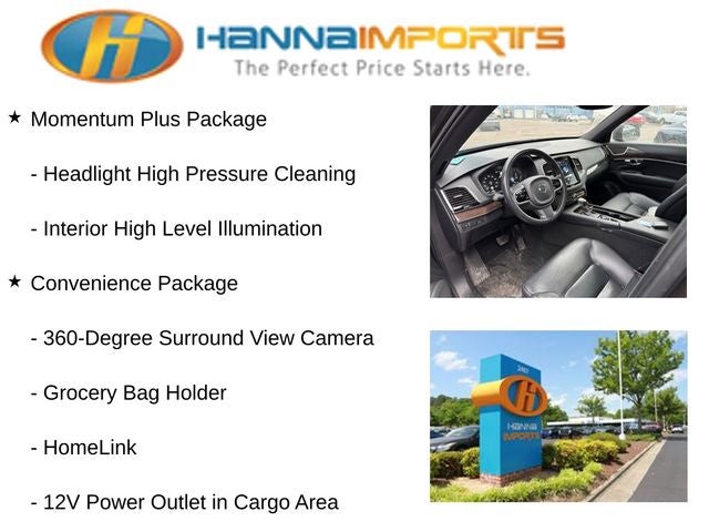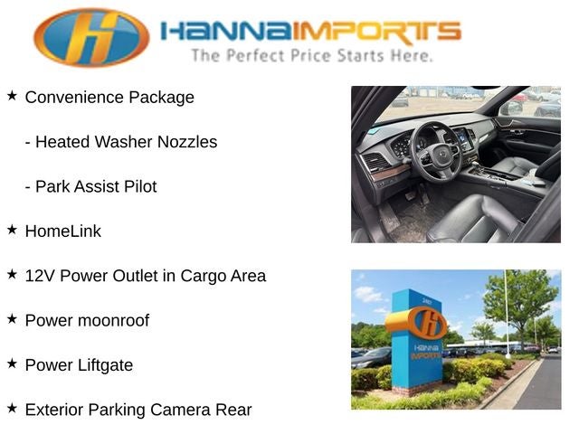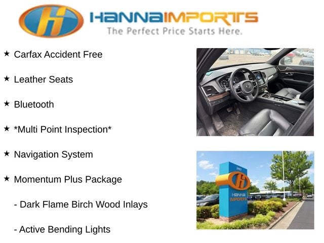 Why shop with Hanna Imports? We specialize in hand-selecting top-quality used cars, trucks, and SUVs for drivers across Raleigh, Durham, Cary, Chapel Hill, and the greater Triangle area of North Carolina. Our massive selection of 1,000+ vehicles on our Raleigh lot is carefully curated to include the most sought-after models, all priced below market value. We believe in transparency and efficiency—our vehicles are aggressively priced from the start, which means no haggling, no hassle, and no wasted time. The price you see is our absolute best price. Whether you're coming from Wake Forest, Apex, Garner, or anywhere in central NC, we’re committed to making your car-buying experience smooth, affordable, and enjoyable. Come see why Hanna Imports is one of the most trusted used car dealerships in North Carolina! Used Volvo XC90 in Raleigh. Used Volvo XC90 in North Carolina, Convenience Package (12V Power Outlet in Cargo Area, 360-Degree Surround View Camera, Compass in Inner Rear View Mirror, Grocery Bag Holder, Heated Washer Nozzles, HomeLink, and Park Assist Pilot), Momentum Plus Package (Active Bending Lights, Dark Flame Birch Wood Inlays, Headlight High Pressure Cleaning, and Interior High Level Illumination), XC90 T6 Momentum, AWD, Charcoal Leather, Exterior Parking Camera Rear, Navigation System, Power Liftgate, Power moonroof, Rear Parking Sensors, 10 Speakers, 3rd row seats: bucket, 4-Wheel Disc Brakes, A/V remote, ABS brakes, Air Conditioning, Alloy wheels, AM/FM radio: SiriusXM, Anti-whiplash front head restraints, Apple CarPlay/Android Auto, Auto High-beam Headlights, Auto-dimming door mirrors, Auto-dimming Rear-View mirror, Automatic temperature control, Brake assist, Bumpers: body-color, Charcoal Headliner, Delay-off headlights, Driver door bin, Driver vanity mirror, Dual front impact airbags, Dual front side impact airbags, Electronic Stability Control, Emergency communication system: Volvo On-Call, Four wheel independent suspension, Front anti-roll bar, Front Bucket Seats, Front Center Armrest w/Storage, Front dual zone A/C, Front fog lights, Front reading lights, Fully automatic headlights, Heated door mirrors, Heated Front Bucket Seats, Heated front seats, Heated Rear Seats, Outer Positions, Heated Steering Wheel, Illuminated entry, Knee airbag, Leather Seating Surfaces w/Charcoal Interior, Leather Shift Knob, Low tire pressure warning, Memory seat, Occupant sensing airbag, Outside temperature display, Overhead airbag, Panic alarm, Passenger door bin, Passenger vanity mirror, Power door mirrors, Power driver seat, Power passenger seat, Power steering, Power windows, Premium audio system: Sensus Connect, Radio data system, Radio: High Performance Audio System, Rain sensing wipers, Rear air conditioning, Rear anti-roll bar, Rear dual zone A/C, Rear fog lights, Rear reading lights, Rear seat center armrest, Rear window defroster, Rear window wiper, Remote keyless entry, Roof rack: rails only, Security system, Speed control, Speed-sensing steering, Split folding rear seat, Spoiler, Steering wheel mounted audio controls, Tachometer, Telescoping steering wheel, Tilt steering wheel, Traction control, Trip computer, Turn signal indicator mirrors, Variably intermittent wipers, and Wheels: 19 10-Spoke Turbine in Silver Bright.
