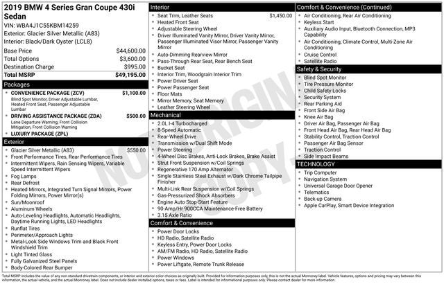 2019 BMW 4 Series 430i Gran Coupe Glacier Silver Metallic 24/34 City/Highway MPG