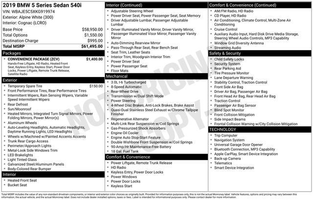 2019 BMW 5 Series 540i Alpine White 21/29 City/Highway MPG