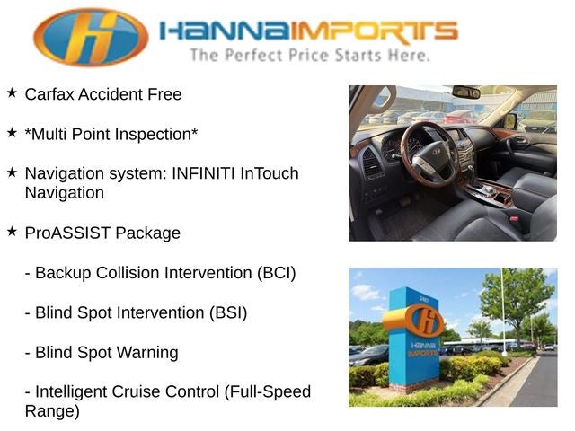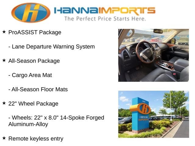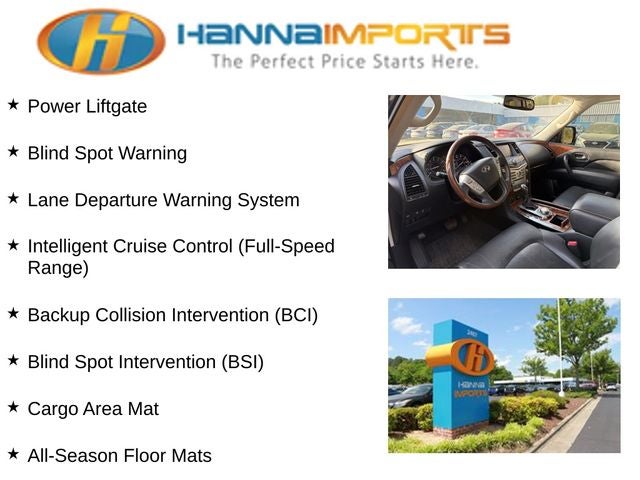 Why shop with Hanna Imports? We specialize in hand-selecting top-quality used cars, trucks, and SUVs for drivers across Raleigh, Durham, Cary, Chapel Hill, and the greater Triangle area of North Carolina. Our massive selection of 1,000+ vehicles on our Raleigh lot is carefully curated to include the most sought-after models, all priced below market value. We believe in transparency and efficiency—our vehicles are aggressively priced from the start, which means no haggling, no hassle, and no wasted time. The price you see is our absolute best price. Whether you're coming from Wake Forest, Apex, Garner, or anywhere in central NC, we’re committed to making your car-buying experience smooth, affordable, and enjoyable. Come see why Hanna Imports is one of the most trusted used car dealerships in North Carolina! Used INFINITI QX80 in Raleigh. Used INFINITI QX80 in North Carolina, 22 Wheel Package (Wheels: 22 x 8.0 14-Spoke Forged Aluminum-Alloy), All-Season Package (All-Season Floor Mats and Cargo Area Mat), ProASSIST Package (Backup Collision Intervention (BCI), Blind Spot Intervention (BSI), Blind Spot Warning, Intelligent Cruise Control (Full-Speed Range), and Lane Departure Warning System), Cargo Package (First-Aid Kit, High-Density Non-Slip Rear Cargo Carpet, and Nylon-Cord Cargo Net), QX80 LUXE, 4WD, Heated front seats, Navigation system: INFINITI InTouch Navigation, Power Liftgate, Power moonroof, Remote keyless entry, 13 Speakers, 2.94 Axle Ratio, 3rd row seats: split-bench, 4-Wheel Disc Brakes, ABS brakes, Air Conditioning, Alloy wheels, AM/FM radio: SiriusXM, Anti-whiplash front head restraints, Auto High-beam Headlights, Auto tilt-away steering wheel, Auto-dimming door mirrors, Auto-dimming Rear-View mirror, Auto-leveling suspension, Automatic temperature control, Brake assist, Bumpers: body-color, CD player, Delay-off headlights, Driver door bin, Driver vanity mirror, Dual front impact airbags, Dual front side impact airbags, DVD-Audio, Electronic Stability Control, Emergency communication system: INFINITI Connection, Four wheel independent suspension, Front anti-roll bar, Front Bucket Seats, Front Center Armrest, Front dual zone A/C, Front fog lights, Front reading lights, Fully automatic headlights, Garage door transmitter: HomeLink, Genuine wood console insert, Genuine wood dashboard insert, Genuine wood door panel insert, Heated door mirrors, Heated Front Bucket Seats, Heated steering wheel, Illuminated entry, Leather Shift Knob, Leather steering wheel, Leather-Appointed Seats w/Stratford Burl Trim, Literature Kit, Low tire pressure warning, Memory seat, Occupant sensing airbag, Outside temperature display, Overhead airbag, Overhead console, Panic alarm, Passenger door bin, Passenger vanity mirror, Power door mirrors, Power driver seat, Power passenger seat, Power steering, Power windows, Radiant Illuminated Kick Plates, Radio data system, Radio: AM/FM/HD w/Single In-Dash CD/DVD Player & MP3, Rain sensing wipers, Rear air conditioning, Rear anti-roll bar, Rear audio controls, Rear reading lights, Rear seat center armrest, Rear window defroster, Rear window wiper, Reclining 3rd row seat, Roof rack: rails only, Roof Rail Cross Bars, Security system, Speed control, Speed-sensing steering, Split folding rear seat, Spoiler, Steering wheel memory, Steering wheel mounted audio controls, Tachometer, Telescoping steerin