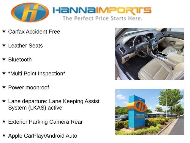 Why shop with Hanna Imports? We specialize in hand-selecting top-quality used cars, trucks, and SUVs for drivers across Raleigh, Durham, Cary, Chapel Hill, and the greater Triangle area of North Carolina. Our massive selection of 1,000+ vehicles on our Raleigh lot is carefully curated to include the most sought-after models, all priced below market value. We believe in transparency and efficiency—our vehicles are aggressively priced from the start, which means no haggling, no hassle, and no wasted time. The price you see is our absolute best price. Whether you're coming from Wake Forest, Apex, Garner, or anywhere in central NC, we’re committed to making your car-buying experience smooth, affordable, and enjoyable. Come see why Hanna Imports is one of the most trusted used car dealerships in North Carolina! Used Acura TLX in Raleigh. Used Acura TLX in North Carolina, Apple CarPlay/Android Auto, Exterior Parking Camera Rear, Heated Front Sport Seats, Lane departure: Lane Keeping Assist System (LKAS) active, Power moonroof, 4-Wheel Disc Brakes, 7 Speakers, ABS brakes, Air Conditioning, Alloy wheels, AM/FM radio: SiriusXM, Anti-whiplash front head restraints, Auto High-beam Headlights, Auto-dimming Rear-View mirror, Automatic temperature control, Brake assist, Bumpers: body-color, CD player, Compass, Delay-off headlights, Driver door bin, Driver vanity mirror, Dual front impact airbags, Dual front side impact airbags, Electronic Stability Control, Four wheel independent suspension, Front anti-roll bar, Front Bucket Seats, Front Center Armrest w/Storage, Front dual zone A/C, Front reading lights, Garage door transmitter: HomeLink, Heated door mirrors, Heated front seats, HVAC memory, Illuminated entry, Knee airbag, Leather Shift Knob, Leather steering wheel, Leatherette-Trimmed Interior, Low tire pressure warning, Memory seat, Occupant sensing airbag, Outside temperature display, Overhead airbag, Overhead console, Panic alarm, Passenger door bin, Passenger vanity mirror, Power door mirrors, Power driver seat, Power passenger seat, Power steering, Power windows, Radio data system, Radio: Acura Premium Audio System, Rear anti-roll bar, Rear reading lights, Rear seat center armrest, Rear window defroster, Remote keyless entry, Security system, Speed control, Speed-sensing steering, Speed-Sensitive Wipers, Split folding rear seat, Steering wheel mounted audio controls, Tachometer, Telescoping steering wheel, Tilt steering wheel, Traction control, Trip computer, Turn signal indicator mirrors, Variably intermittent wipers, and Wheels: 17 x 7.5 Pewter Gray Aluminum Alloy.