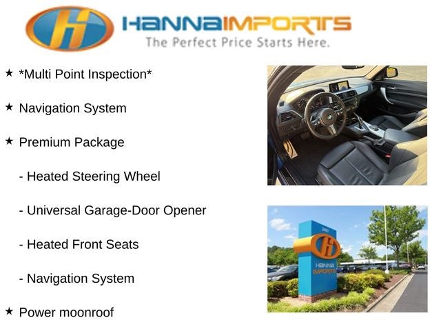 Why shop with Hanna Imports? We specialize in hand-selecting top-quality used cars, trucks, and SUVs for drivers across Raleigh, Durham, Cary, Chapel Hill, and the greater Triangle area of North Carolina. Our massive selection of 1,000+ vehicles on our Raleigh lot is carefully curated to include the most sought-after models, all priced below market value. We believe in transparency and efficiency—our vehicles are aggressively priced from the start, which means no haggling, no hassle, and no wasted time. The price you see is our absolute best price. Whether you're coming from Wake Forest, Apex, Garner, or anywhere in central NC, we’re committed to making your car-buying experience smooth, affordable, and enjoyable. Come see why Hanna Imports is one of the most trusted used car dealerships in North Carolina! Used BMW 2 Series in Raleigh. Used BMW 2 Series in North Carolina, Premium Package (Advanced Real-Time Traffic Information, Apple CarPlay Compatibility w/1 Year Trial, Heated Front Seats, Heated Steering Wheel, Navigation System, Remote Services, Speed Limit Info, and Universal Garage-Door Opener), 2 Series M240i, 2D Coupe, Exterior Parking Camera Rear, Power moonroof, 4-Wheel Disc Brakes, 6 Speakers, ABS brakes, Adaptive suspension, Air Conditioning, Alloy wheels, AM/FM radio: SiriusXM, Auto-dimming door mirrors, Auto-dimming Rear-View mirror, Automatic temperature control, BMW Assist eCall, BMW TeleServices, Brake assist, Bumpers: body-color, ConnectedDrive Services, Delay-off headlights, Driver door bin, Driver vanity mirror, Dual front impact airbags, Dual front side impact airbags, DVD Area Coding (North America), Electronic Stability Control, Emergency communication system: BMW Assist eCall, Four wheel independent suspension, Front anti-roll bar, Front Bucket Seats, Front Center Armrest, Front dual zone A/C, Front reading lights, Front Sport Seats, Fully automatic headlights, Hands-Free Bluetooth® & USB Audio Connection, harman/kardon® Logic 7® Digital Surround, Heated door mirrors, Hi-Fi Sound System, Illuminated entry, Instrument Cluster w/Extended Contents, Knee airbag, Leather Shift Knob, Low tire pressure warning, Lumbar Support, Memory seat, Occupant sensing airbag, Outside temperature display, Overhead airbag, Panic alarm, Passenger door bin, Passenger vanity mirror, Power door mirrors, Power driver seat, Power Front Seats, Power passenger seat, Power steering, Power windows, Radio BMW Professional, Radio Control US, Radio data system, Radio: AM/FM Audio System, Rain sensing wipers, Rear anti-roll bar, Rear window defroster, Remote keyless entry, Security system, SensaTec Upholstery, SiriusXM Satellite Radio, Speed control, Speed-sensing steering, Speed-Sensitive Wipers, Split folding rear seat, Spoiler, Sport steering wheel, Steering wheel mounted audio controls, Tachometer, Telescoping steering wheel, Tilt steering wheel, Traction control, Trip computer, Turn signal indicator mirrors, Variably intermittent wipers, and Wheels: 18 x 7.5 M Jet Black (Style 719M)