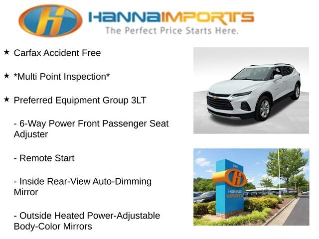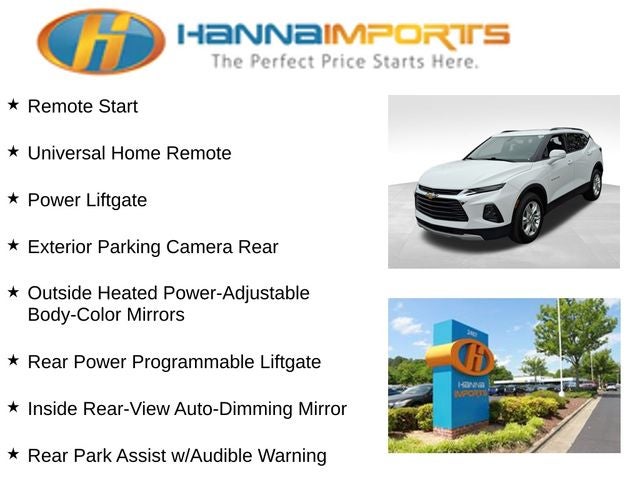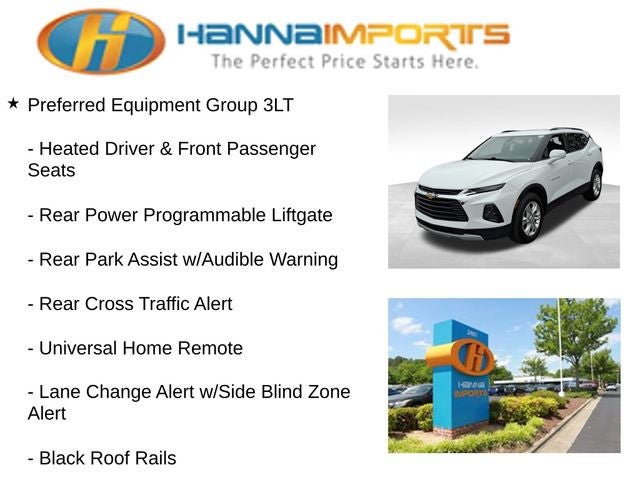 Why shop with Hanna Imports? We specialize in hand-selecting top-quality used cars, trucks, and SUVs for drivers across Raleigh, Durham, Cary, Chapel Hill, and the greater Triangle area of North Carolina. Our massive selection of 1,000+ vehicles on our Raleigh lot is carefully curated to include the most sought-after models, all priced below market value. We believe in transparency and efficiency—our vehicles are aggressively priced from the start, which means no haggling, no hassle, and no wasted time. The price you see is our absolute best price. Whether you're coming from Wake Forest, Apex, Garner, or anywhere in central NC, we’re committed to making your car-buying experience smooth, affordable, and enjoyable. Come see why Hanna Imports is one of the most trusted used car dealerships in North Carolina! Used Chevrolet Blazer in Raleigh. Used Chevrolet Blazer in North Carolina, Preferred Equipment Group 3LT (6-Way Power Front Passenger Seat Adjuster, Black Roof Rails, Heated Driver & Front Passenger Seats, Inside Rear-View Auto-Dimming Mirror, Lane Change Alert w/Side Blind Zone Alert, Outside Heated Power-Adjustable Body-Color Mirrors, Rear Cross Traffic Alert, Rear Park Assist w/Audible Warning, Rear Power Programmable Liftgate, Remote Start, and Universal Home Remote), Blazer LT, Summit White, Exterior Parking Camera Rear, Power Liftgate, 155 Amp Alternator, 170 Amp Alternator, 4-Wheel Disc Brakes, 6 Speakers, 6-Speaker Audio System Feature, ABS brakes, Air Conditioning, Alloy wheels, AM/FM radio: SiriusXM, Apple CarPlay/Android Auto, Auto-dimming door mirrors, Auto-dimming Rear-View mirror, Automatic temperature control, Brake assist, Bumpers: body-color, Child-Seat-Sensing Airbag, Compass, Delay-off headlights, Driver door bin, Driver vanity mirror, Dual front impact airbags, Dual front side impact airbags, Electronic Stability Control, Emergency communication system: OnStar and Chevrolet connected services capable, Four wheel independent suspension, Front anti-roll bar, Front Bucket Seats, Front Center Armrest, Front dual zone A/C, Front reading lights, Fully automatic headlights, Garage door transmitter, Heated door mirrors, Heated front seats, High-Intensity Discharge Headlights, Illuminated entry, Knee airbag, Leather Shift Knob, Low tire pressure warning, Occupant sensing airbag, Outside temperature display, Overhead airbag, Overhead console, Panic alarm, Passenger door bin, Passenger vanity mirror, Perforated Leather-Appointed Seat Trim, Power door mirrors, Power driver seat, Power passenger seat, Power steering, Power windows, Radio data system, Radio: Chevrolet Infotainment 3 System, Rear anti-roll bar, Rear reading lights, Rear seat center armrest, Rear window defroster, Rear window wiper, Remote keyless entry, Ride & Handling Suspension, Security system, SiriusXM Radio, Speed control, Speed-sensing steering, Split folding rear seat, Spoiler, Steering wheel mounted audio controls, Tachometer, Telescoping steering wheel, Tilt steering wheel, Traction control, Trip computer, Turn signal indicator mirrors, Variably intermittent wipers, Voltmeter, and Wheels: 18 Bright Silver Aluminum.