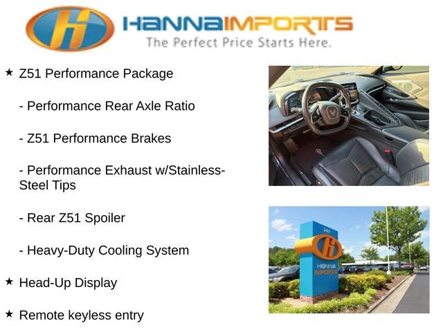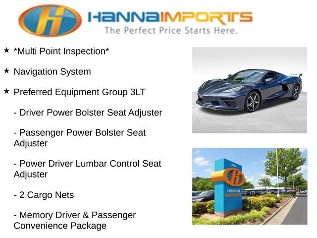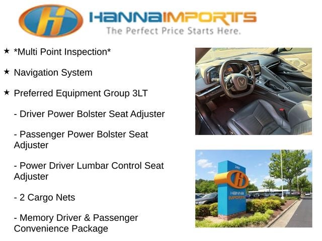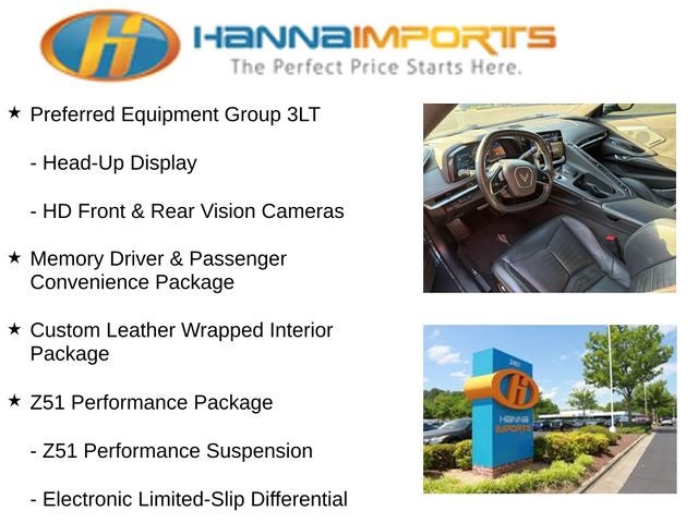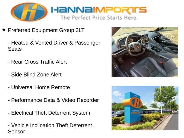 Why shop with Hanna Imports? We specialize in hand-selecting top-quality used cars, trucks, and SUVs for drivers across Raleigh, Durham, Cary, Chapel Hill, and the greater Triangle area of North Carolina. Our massive selection of 1,000+ vehicles on our Raleigh lot is carefully curated to include the most sought-after models, all priced below market value. We believe in transparency and efficiency—our vehicles are aggressively priced from the start, which means no haggling, no hassle, and no wasted time. The price you see is our absolute best price. Whether you're coming from Wake Forest, Apex, Garner, or anywhere in central NC, we’re committed to making your car-buying experience smooth, affordable, and enjoyable. Come see why Hanna Imports is one of the most trusted used car dealerships in North Carolina! Used Chevrolet Corvette in Raleigh. Used Chevrolet Corvette in North Carolina, Custom Leather Wrapped Interior Package, Memory Driver & Passenger Convenience Package, Preferred Equipment Group 3LT (2 Cargo Nets, Driver Power Bolster Seat Adjuster, Electrical Theft Deterrent System, HD Front & Rear Vision Cameras, Head-Up Display, Heated & Vented Driver & Passenger Seats, Heated Steering Wheel, Passenger Power Bolster Seat Adjuster, Performance Data & Video Recorder, Power Driver Lumbar Control Seat Adjuster, Power Passenger Lumbar Control Seat Adjuster, Power-Adjustable Outside Heated Mirrors, Rear Camera Mirror, Rear Cross Traffic Alert, Side Blind Zone Alert, Sueded Microfiber-Wrapped Upper Interior Trim Pkg, Universal Home Remote, Vehicle Inclination Theft Deterrent Sensor, Vehicle Interior Movement Theft Deterrent Sensor, and Wireless Charging for Devices), Z51 Performance Package (Electronic Limited-Slip Differential, Heavy-Duty Cooling System, Performance Exhaust w/Stainless-Steel Tips, Performance Rear Axle Ratio, Rear Z51 Spoiler, Z51 Performance Brakes, and Z51 Performance Suspension), Apple CarPlay/Android Auto, Carbon Fiber Interior Trim, High Wing Spoiler (LPO) (DISC), Navigation System, Rear Parking Sensors, Remote keyless entry, Transparent Removable Roof Panel, 14 Speakers, 4-Wheel Disc Brakes, 8-Way Power Driver Seat Adjuster, 8-Way Power Passenger Seat Adjuster, ABS brakes, Air Conditioning, Alloy wheels, AM/FM radio: SiriusXM, Auto-dimming door mirrors, Auto-dimming Rear-View mirror, Automatic temperature control, Bose Performance Series Sound System w/14 Speakers, Brake assist, Bumpers: body-color, Compass, Delay-off headlights, Driver door bin, Driver vanity mirror, Dual front impact airbags, Dual front side impact airbags, Electronic Stability Control, Emergency communication system: O