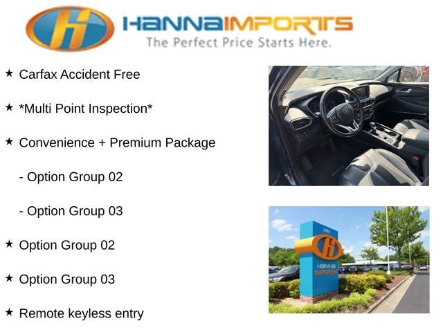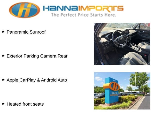 Why shop with Hanna Imports? We specialize in hand-selecting top-quality used cars, trucks, and SUVs for drivers across Raleigh, Durham, Cary, Chapel Hill, and the greater Triangle area of North Carolina. Our massive selection of 1,000+ vehicles on our Raleigh lot is carefully curated to include the most sought-after models, all priced below market value. We believe in transparency and efficiency—our vehicles are aggressively priced from the start, which means no haggling, no hassle, and no wasted time. The price you see is our absolute best price. Whether you're coming from Wake Forest, Apex, Garner, or anywhere in central NC, we’re committed to making your car-buying experience smooth, affordable, and enjoyable. Come see why Hanna Imports is one of the most trusted used car dealerships in North Carolina! Used Hyundai Santa Fe in Raleigh. Used Hyundai Santa Fe in North Carolina, Convenience + Premium Package (Option Group 02, Option Group 03, Panoramic Sunroof, 18 x 7.5J Alloy Wheels, 8-Way Power Adjustable Passenger Seat, Acoustic-Laminated Front Side Windows, Auto-Dimming Inside Rear-View Mirror, Dual Automatic Temperature Control, Hands-Free Smart Liftgate w/Auto Open, Leather Seating Surfaces, Leather Wrapped Steering Wheel & Shift Knob, LED Fog Lights, LED Headlights, LED Interior Lights, LED Taillights, Manual Rear Side Sunshades, Parking Distance Warning-Reverse, Radio: Infinity Premium AM/FM/MP3 Display Audio, Roof Side Rails, Satin Chrome Exterior Door Handles, Side Mirrors w/Turn Signal Indicators, and Ultrasonic Rear Occupant Alert), Santa Fe SEL, AWD, Black/Black Leather, Apple CarPlay & Android Auto, Exterior Parking Camera Rear, Heated front seats, Remote keyless entry, 17 x 7.0J Alloy Wheels, 4-Wheel Disc Brakes, 6 Speakers, ABS brakes, Air Conditioning, Alloy wheels, AM/FM radio: SiriusXM, Auto High-beam Headlights, Axle Ratio 4.081, Brake assist, Bumpers: body-color, Cargo Cover, Cargo Net, Cargo Tray, Carpeted Floor Mats, Delay-off headlights, Driver door bin, Driver vanity mirror, Dual front impact airbags, Dual front side impact airbags, Electronic Stability Control, Emergency communication system, First Aid Kit, Four wheel independent suspension, Front anti-roll bar, Front Bucket Seats, Front Center Armrest, Front fog lights, Front reading lights, Fully automatic headlights, Heated door mirrors, Heated Front Bucket Seats, Illuminated entry, Low tire pressure warning, Occupant sensing airbag, Outside temperature display, Overhead airbag, Overhead console, Panic alarm, Passenger door bin, Passenger vanity mirror, Power door mirrors, Power driver seat, Power steering, Power windows, Radio: AM/FM/MP3 Display Audio, Rear anti-roll bar, Rear seat center armrest, Rear window defroster, Rear window wiper, Security system, Speed control, Speed-sensing steering, Split folding rear seat, Spoiler, Stain-Resistant Cloth Seating Surfaces, Steering wheel mounted audio controls, Tachometer, Telescoping steering wheel, Tilt steering wheel, Traction control, Trip computer, and Variably intermittent wipers.