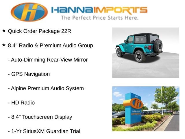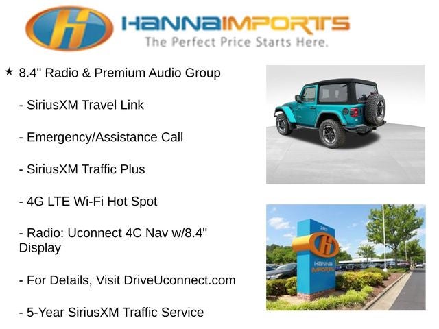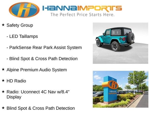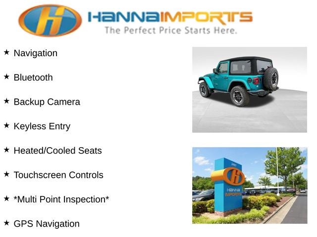 Why shop with Hanna Imports? We specialize in hand-selecting top-quality used cars, trucks, and SUVs for drivers across Raleigh, Durham, Cary, Chapel Hill, and the greater Triangle area of North Carolina. Our massive selection of 1,000+ vehicles on our Raleigh lot is carefully curated to include the most sought-after models, all priced below market value. We believe in transparency and efficiency—our vehicles are aggressively priced from the start, which means no haggling, no hassle, and no wasted time. The price you see is our absolute best price. Whether you're coming from Wake Forest, Apex, Garner, or anywhere in central NC, we’re committed to making your car-buying experience smooth, affordable, and enjoyable. Come see why Hanna Imports is one of the most trusted used car dealerships in North Carolina! Used Jeep Wrangler in Raleigh. Used Jeep Wrangler in North Carolina, 8.4 Radio & Premium Audio Group (1-Yr SiriusXM Guardian Trial, 4G LTE Wi-Fi Hot Spot, 5-Year SiriusXM Traffic Service, 5-Year SiriusXM Travel Link Service, 8.4 Touchscreen Display, Alpine Premium Audio System, Auto-Dimming Rear-View Mirror, Emergency/Assistance Call, For Details, Visit DriveUconnect.com, GPS Navigation, HD Radio, Radio: Uconnect 4C Nav w/8.4 Display, SiriusXM Traffic Plus, and SiriusXM Travel Link), Quick Order Package 22R, Safety Group (Blind Spot & Cross Path Detection, LED Taillamps, and ParkSense Rear Park Assist System), Cold Weather Group (Heated Front Seats and Heated Steering Wheel), LED Lighting Group (Daytime Running Lamps LED Accents, Front LED Fog Lamps, and LED Reflector Headlamps), Wrangler Rubicon, 4-Wheel Disc Brakes, 4.10 Rear Axle Ratio, 8 Speakers, 97 MPH Vehicle Max Speed Calibration, ABS brakes, Air Conditioning, Alloy wheels, AM/FM radio: SiriusXM, Apple CarPlay/Android Auto, Automatic temperature control, Aux Battery, BF Goodrich Brand Tires, Body Color Fender Flares, Brake assist, Compass, Delay-off headlights, Driver door bin, Driver vanity mirror, Dual front impact airbags, Dual front side impact airbags, Electronic Stability Control, Engine Block Heater, Front anti-roll bar, Front Bucket Seats, Front Center Armrest w/Storage, Front dual zone A/C, Front fog lights, Front License Plate Bracket, Front reading lights, Fully automatic headlights, Garage door transmitter, Heated door mirrors, Illuminated entry, Integrated roll-over protection, Leather steering wheel, Low tire pressure warning, Manuf Statement of Origin, MOPAR Satin Black Grille, Non-Lock Fuel Cap w/o Discriminator, Occupant sensing airbag, Outside temperature display, Panic alarm, ParkView Rear Back-Up Camera, Passenger door bin, Passenger vanity mirror, Performance Suspension, Power door mirrors, Power steering, Power windows, Premium Black Sunrider Soft Top, Premium Cloth Low-Back Bucket Seats, Radio data system, Radio: Uconnect 4 w/7 Display, Rear anti-roll bar, Rear reading lights, Remote keyless entry, Remote Proximity Keyless Entry, Remote Start System, Security system, Speed control, Steering wheel mounted audio controls, Stop-Start Dual Battery System, Tachometer, Telescoping steering wheel, Tilt steering wheel, Traction control, Trip co