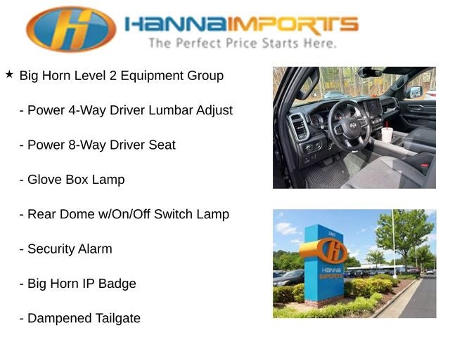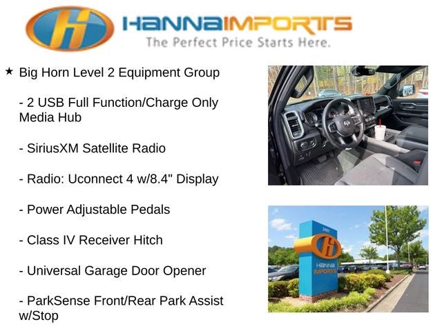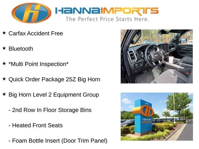 Why shop with Hanna Imports? We specialize in hand-selecting top-quality used cars, trucks, and SUVs for drivers across Raleigh, Durham, Cary, Chapel Hill, and the greater Triangle area of North Carolina. Our massive selection of 1,000+ vehicles on our Raleigh lot is carefully curated to include the most sought-after models, all priced below market value. We believe in transparency and efficiency—our vehicles are aggressively priced from the start, which means no haggling, no hassle, and no wasted time. The price you see is our absolute best price. Whether you're coming from Wake Forest, Apex, Garner, or anywhere in central NC, we’re committed to making your car-buying experience smooth, affordable, and enjoyable. Come see why Hanna Imports is one of the most trusted used car dealerships in North Carolina! Used Ram 1500 in Raleigh. Used Ram 1500 in North Carolina, Big Horn Level 2 Equipment Group (115V Auxiliary Power Outlet, 115V Auxiliary Rear Power Outlet, 2 USB Full Function/Charge Only Media Hub, 2nd Row In Floor Storage Bins, 400W Inverter, Air Conditioning ATC w/Dual Zone Control, Auto-Dimming Rear-View Mirror, Big Horn IP Badge, Black Premium Power Mirrors, Class IV Receiver Hitch, Dampened Tailgate, Foam Bottle Insert (Door Trim Panel), Glove Box Lamp, Heated Front Seats, Heated Steering Wheel, ParkSense Front/Rear Park Assist w/Stop, Power 4-Way Driver Lumbar Adjust, Power 8-Way Driver Seat, Power Adjustable Pedals, Radio: Uconnect 4 w/8.4 Display, Rear Dome w/On/Off Switch Lamp, Rear Power Sliding Window, Rear Window Defroster, Security Alarm, SiriusXM Satellite Radio, Sun Visors w/Illuminated Vanity Mirrors, and Universal Garage Door Opener), Night Edition (Anti-Spin Differential Rear Axle, Auto-Dimming Exterior Driver Mirror, Black Exterior Truck Badging, Black Headlamp Bezels, Black Interior Accents, Body Color Door Handles, Body Color Exterior Mirrors, Body Color Front Bumper, Body Color Premium Power Mirrors, Body Color Rear Bumper w/Step Pads, Deluxe Cloth Bucket Seats, Dual Exhaust w/Black Tips, Exterior Mirrors Courtesy Lamps, Exterior Mirrors w/Memory, Grille Surround 1 Black Texture 2 Black, Power-Folding Mirrors, Wheels: 20 x 9.0 Premium Paint/Polished, 3 Rear Seat Head Restraints, 4 Way Front Headrests, Bucket Seats, Front Seat Back Map Pockets, Full Length Floor Console, Manual Adjust 4-Way F