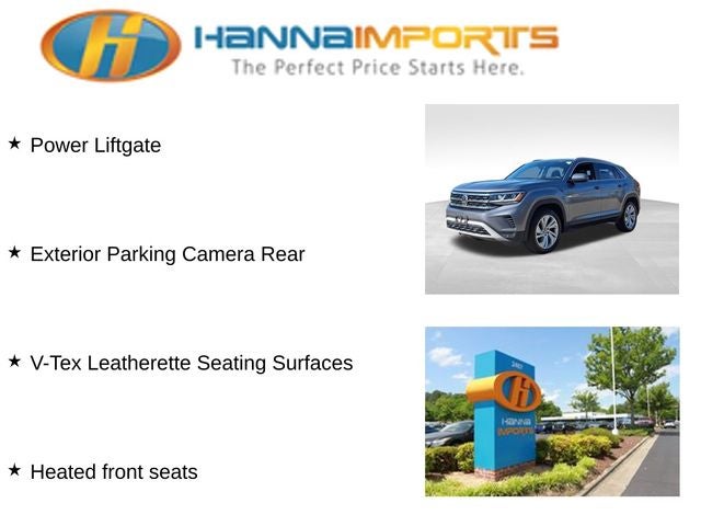 Why shop with Hanna Imports? We specialize in hand-selecting top-quality used cars, trucks, and SUVs for drivers across Raleigh, Durham, Cary, Chapel Hill, and the greater Triangle area of North Carolina. Our massive selection of 1,000+ vehicles on our Raleigh lot is carefully curated to include the most sought-after models, all priced below market value. We believe in transparency and efficiency—our vehicles are aggressively priced from the start, which means no haggling, no hassle, and no wasted time. The price you see is our absolute best price. Whether you're coming from Wake Forest, Apex, Garner, or anywhere in central NC, we’re committed to making your car-buying experience smooth, affordable, and enjoyable. Come see why Hanna Imports is one of the most trusted used car dealerships in North Carolina! Used Volkswagen Atlas Cross Sport in Raleigh. Used Volkswagen Atlas Cross Sport in North Carolina, Trailer Hitch Extras, Atlas Cross Sport 3.6L V6 SEL 4Motion, AWD, Exterior Parking Camera Rear, Heated front seats, Navigation System, Power Liftgate, Power moonroof, Remote keyless entry, V-Tex Leatherette Seating Surfaces, 3.60 Axle Ratio, 4-Wheel Disc Brakes, 6 Speakers, ABS brakes, Active Blind Spot Monitor, Air Conditioning, Alloy wheels, AM/FM radio: SiriusXM, Auto High-beam Headlights, Auto-dimming Rear-View mirror, Automatic temperature control, Brake assist, Bumpers: body-color, Compass, Delay-off headlights, Driver door bin, Driver vanity mirror, Dual front impact airbags, Dual front side impact airbags, Electronic Stability Control, Emergency communication system: VW Car-Net services (capabilities require enrollment or subscription), Four wheel independent suspension, Front anti-roll bar, Front Bucket Seats, Front Center Armrest, Front dual zone A/C, Front fog lights, Front reading lights, Fully automatic headlights, Heated Comfort Front Bucket Seats, Heated door mirrors, Heated steering wheel, Heavy Duty Trunk Liner w/VW CarGo Blocks, Illuminated entry, Leather Shift Knob, Low tire pressure warning, Memory seat, Occupant sensing airbag, Outside temperature display, Overhead airbag, Overhead console, Panic alarm, Passenger door bin, Passenger vanity mirror, Power door mirrors, Power driver seat, Power passenger seat, Power steering, Power windows, Privacy Cover, Radio data system, Radio: Discover Media w/8.0 Touchscreen Nav, Rain sensing wipers, Rear anti-roll bar, Rear reading lights, Rear seat center armrest, Rear window defroster, Rear window wiper, Remote CD player, Roadside Assistance Kit, Roof rack: rails only, Rubber Mats Kit, Security system, Speed control, Speed-sensing steering, Split folding rear seat, Spoiler, Standard Suspension, Steering wheel mounted audio controls, Tachometer, Telescoping steering wheel, Tilt steering wheel, Traction control, Trip computer, Turn signal indicator mirrors, Variably intermittent wipers, VW App-Connect (w/Apple CarPlay, Android Auto & MirrorLink), and Wheels: 20 5-Spoke Silver Alloy (V71)
