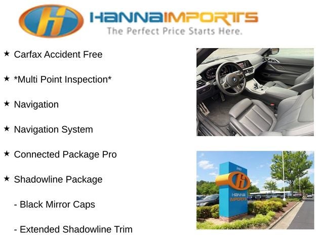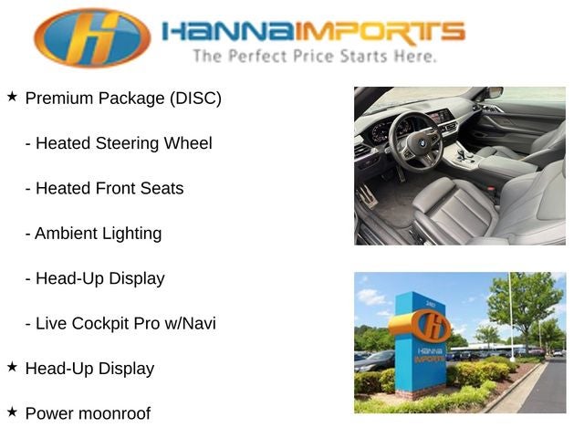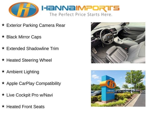 Why shop with Hanna Imports? We specialize in hand-selecting top-quality used cars, trucks, and SUVs for drivers across Raleigh, Durham, Cary, Chapel Hill, and the greater Triangle area of North Carolina. Our massive selection of 1,000+ vehicles on our Raleigh lot is carefully curated to include the most sought-after models, all priced below market value. We believe in transparency and efficiency—our vehicles are aggressively priced from the start, which means no haggling, no hassle, and no wasted time. The price you see is our absolute best price. Whether you're coming from Wake Forest, Apex, Garner, or anywhere in central NC, we’re committed to making your car-buying experience smooth, affordable, and enjoyable. Come see why Hanna Imports is one of the most trusted used car dealerships in North Carolina! Used BMW 4 Series in Raleigh. Used BMW 4 Series in North Carolina, Connected Package Pro, Premium Package (DISC) (Ambient Lighting, Head-Up Display, Heated Front Seats, Heated Steering Wheel, and Live Cockpit Pro w/Navi), Shadowline Package (Black Mirror Caps and Extended Shadowline Trim), 4 Series M440i xDrive, Apple CarPlay Compatibility, Exterior Parking Camera Rear, Navigation, Navigation System, Power moonroof, 10 Speakers, 4-Wheel Disc Brakes, ABS brakes, Air Conditioning, Alloy wheels, AM/FM Radio, AM/FM radio: SiriusXM with 360L, Auto High-beam Headlights, Auto-dimming door mirrors, Auto-dimming Rear-View mirror, Automatic temperature control, BMW Assist eCall, BMW TeleServices, Brake assist, Bumpers: body-color, Compass, ConnectedDrive Services, Delay-off headlights, Driver door bin, Driver vanity mirror, Dual front impact airbags, Dual front side impact airbags, Electronic Stability Control, Emergency communication system: BMW Assist eCall, Four wheel independent suspension, Front anti-roll bar, Front Bucket Seats, Front Center Armrest, Front dual zone A/C, Front reading lights, Fully automatic headlights, Garage door transmitter, harman/kardon Surround Sound System, Heated door mirrors, Hi-Fi Sound System, Illuminated entry, Knee airbag, Low tire pressure warning, Lumbar Support, M Sport Brakes w/Red Calipers, Memory seat, Occupant sensing airbag, Outside temperature display, Overhead airbag, Overhead console, Panic alarm, Passenger door bin, Passenger vanity mirror, Power door mirrors, Power driver seat, Power Front Seats, Power passenger seat, Power steering, Power windows, Radio Control US, Radio data system, Rain sensing wipers, Rear air conditioning, Rear anti-roll bar, Rear reading lights, Rear seat center armrest, Rear window defroster, Remote Engine Start, Remote keyless entry, Security system, SensaTec Upholstery, SiriusXM w/360L, Speed control, Speed-sensing steering, Speed-Sensitive Wipers, Split folding rear seat, Spoiler, Sport Seats, Sport steering wheel, Steering wheel mounted audio controls, Tachometer, Telescoping steering wheel, Tilt steering wheel, Traction control, Trip computer, Turn signal indicator mirrors, Variably intermittent wipers, and Wheels: 18 x 7.5 M Double-Spoke Bicolor.