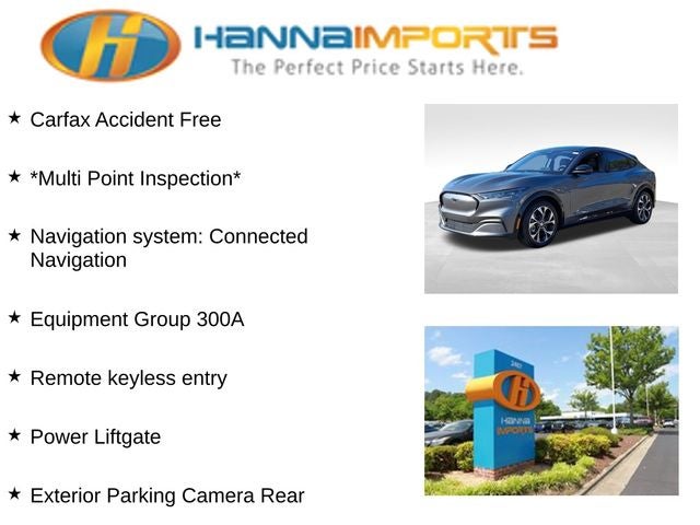 Why shop with Hanna Imports? We specialize in hand-selecting top-quality used cars, trucks, and SUVs for drivers across Raleigh, Durham, Cary, Chapel Hill, and the greater Triangle area of North Carolina. Our massive selection of 1,000+ vehicles on our Raleigh lot is carefully curated to include the most sought-after models, all priced below market value. We believe in transparency and efficiency—our vehicles are aggressively priced from the start, which means no haggling, no hassle, and no wasted time. The price you see is our absolute best price. Whether you're coming from Wake Forest, Apex, Garner, or anywhere in central NC, we’re committed to making your car-buying experience smooth, affordable, and enjoyable. Come see why Hanna Imports is one of the most trusted used car dealerships in North Carolina! Used Ford Mustang Mach-E in Raleigh. Used Ford Mustang Mach-E in North Carolina, Equipment Group 300A, Mustang Mach-E Premium, AWD, Exterior Parking Camera Rear, Navigation system: Connected Navigation, Power Liftgate, Remote keyless entry, 10 Speakers, 4-Wheel Disc Brakes, ABS brakes, Air Conditioning, Alloy wheels, AM/FM radio: SiriusXM, AM/FM Stereo, Apple CarPlay/Android Auto, Auto High-beam Headlights, Auto-dimming Rear-View mirror, Automatic temperature control, Axle Ratio: 9.05, Brake assist, Bumpers: body-color, Compass, Delay-off headlights, Driver door bin, Driver vanity mirror, Dual front impact airbags, Dual front side impact airbags, Electronic Stability Control, Emergency communication system: 911 Assist, Four wheel independent suspension, Front anti-roll bar, Front Bucket Seats, Front Center Armrest, Front dual zone A/C, Front reading lights, Fully automatic headlights, Garage door transmitter, Heated door mirrors, Heated front seats, Heated Perforated ActiveX Bucket Seats, Heated steering wheel, Illuminated entry, Knee airbag, Low tire pressure warning, Memory seat, Occupant sensing airbag, Outside temperature display, Overhead airbag, Overhead console, Panic alarm, Passenger door bin, Passenger vanity mirror, Power door mirrors, Power driver seat, Power passenger seat, Power steering, Power windows, Radio data system, Rain sensing wipers, Rear anti-roll bar, Rear seat center armrest, Rear side impact airbag, Rear window defroster, Rear window wiper, Security system, SiriusXM Radio w/360L, Speed control, Speed-sensing steering, Speed-Sensitive Wipers, Split folding rear seat, Spoiler, Steering wheel mounted audio controls, SYNC 4A w/Enhanced Voice Recognition, Telescoping steering wheel, Tilt steering wheel, Traction control, Trip computer, Turn signal indicator mirrors, Variably intermittent wipers, and Wheels: 19 Machined-Face Aluminum.