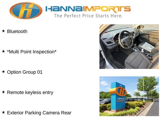Why shop with Hanna Imports? We specialize in hand-selecting top-quality used cars, trucks, and SUVs for drivers across Raleigh, Durham, Cary, Chapel Hill, and the greater Triangle area of North Carolina. Our massive selection of 1,000+ vehicles on our Raleigh lot is carefully curated to include the most sought-after models, all priced below market value. We believe in transparency and efficiency—our vehicles are aggressively priced from the start, which means no haggling, no hassle, and no wasted time. The price you see is our absolute best price. Whether you're coming from Wake Forest, Apex, Garner, or anywhere in central NC, we’re committed to making your car-buying experience smooth, affordable, and enjoyable. Come see why Hanna Imports is one of the most trusted used car dealerships in North Carolina! Used Hyundai Accent in Raleigh. Used Hyundai Accent in North Carolina, Option Group 01, Accent SE, Black Cloth, Exterior Parking Camera Rear, Remote keyless entry, 4 Speakers, ABS brakes, Air Conditioning, AM/FM radio, Anti-whiplash front head restraints, Brake assist, Bumpers: body-color, Cloth Seat Trim, Driver door bin, Driver vanity mirror, Dual front impact airbags, Dual front side impact airbags, Electronic Stability Control, Front anti-roll bar, Front Bucket Seats, Front reading lights, Front wheel independent suspension, Illuminated entry, Low tire pressure warning, Occupant sensing airbag, Outside temperature display, Overhead airbag, Overhead console, Panic alarm, Passenger door bin, Passenger vanity mirror, Power door mirrors, Power steering, Power windows, Radio: Audio AM/FM, Rear window defroster, Security system, Speed control, Speed-sensing steering, Split folding rear seat, Steering wheel mounted audio controls, Tachometer, Tilt steering wheel, Traction control, Trip computer, and Wheels: 5.5J x 15 Steel w/Covers.