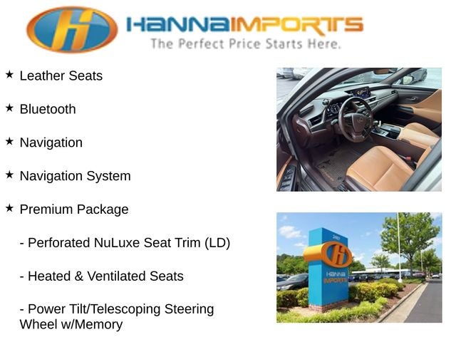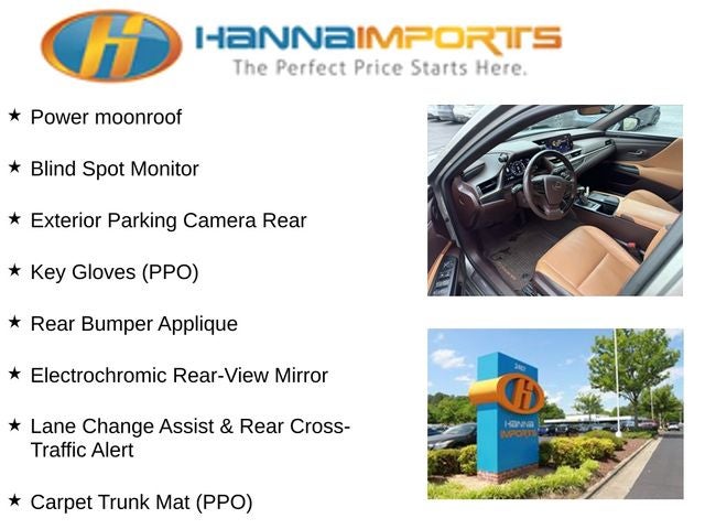 Why shop with Hanna Imports? We specialize in hand-selecting top-quality used cars, trucks, and SUVs for drivers across Raleigh, Durham, Cary, Chapel Hill, and the greater Triangle area of North Carolina. Our massive selection of 1,000+ vehicles on our Raleigh lot is carefully curated to include the most sought-after models, all priced below market value. We believe in transparency and efficiency—our vehicles are aggressively priced from the start, which means no haggling, no hassle, and no wasted time. The price you see is our absolute best price. Whether you're coming from Wake Forest, Apex, Garner, or anywhere in central NC, we’re committed to making your car-buying experience smooth, affordable, and enjoyable. Come see why Hanna Imports is one of the most trusted used car dealerships in North Carolina! Used Lexus ES in Raleigh. Used Lexus ES in North Carolina, Accessory Package 2 (PPO) (Alloy Wheel Locks, Cargo Net (PPO), Carpet Trunk Mat (PPO), Key Gloves (PPO), and Rear Bumper Applique), Premium Package (Heated & Ventilated Seats, Perforated NuLuxe Seat Trim (LD), Power Tilt/Telescoping Steering Wheel w/Memory, and Rain Sensing Wipers), Flaxen w/Linear Espresso Wood Trim w/Perforated Leather Seat Trim, Apple CarPlay/Android Auto, Blind Spot Monitor, Electrochromic Rear-View Mirror, Exterior Parking Camera Rear, Heated Leather & Wood Steering Wheel, Lane Change Assist & Rear Cross-Traffic Alert, Navigation, Navigation System, Power moonroof, Windshield De-Icer, 10 Speakers, 10-Way Power Adjustable Front Seats, 4-Wheel Disc Brakes, ABS brakes, Air Conditioning, All-Weather Floor Liners w/Trunk Tray (PPO), AM/FM radio: SiriusXM, Auto Braking Protection, Auto High-beam Headlights, Auto-dimming door mirrors, Auto-dimming Rear-View mirror, Automatic temperature control, Blind Spot Monitor w/Park Assist, Brake assist, Bumpers: body-color, CD player, Compass, Delay-off headlights, Driver door bin, Driver vanity mirror, Dual front impact airbags, Dual front side impact airbags, Electronic Stability Control, Emergency communication system, Four wheel independent suspension, Front anti-roll bar, Front Bucket Seats, Front Center Armrest, Front dual zone A/C, Front reading lights, Fully automatic headlights, Garage door transmitter: HomeLink, Illuminated entry, Intelligent Clearance Sonar, Knee airbag, Leather Shift Knob, Leather steering wheel, Low tire pressure warning, Occupant sensing airbag, Outside temperature display, Overhead airbag, Overhead console, Panic alarm, Passenger door bin, Passenger vanity mirror, Perforated NuLuxe Seat Trim, Power door mirrors, Power driver seat, Power passenger seat, Power steering, Power windows, Radio data system, Radio: Multimedia System w/8 Color Display, Rear anti-roll bar, Rear Pedestrian Detection, Rear reading lights, Rear seat center armrest, Rear side impact airbag, Rear window defroster, Remote keyless entry, Security system, Speed control, Speed-sensing steering, Steering wheel mounted audio controls, Tachometer, Telescoping steering wheel, Tilt steering wheel, Traction control, Trip computer, Turn signal indicator mirrors, Variably intermittent wipers, Wheels: 18 x 8J Split 10-Spoke High Gloss, and Wood Trim (XG)