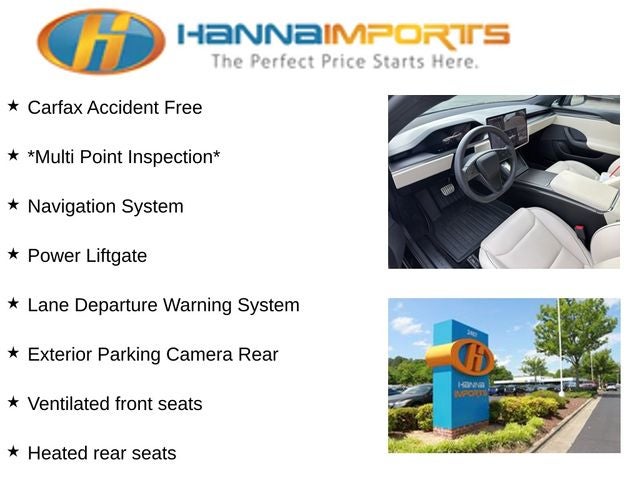 Why shop with Hanna Imports? We specialize in hand-selecting top-quality used cars, trucks, and SUVs for drivers across Raleigh, Durham, Cary, Chapel Hill, and the greater Triangle area of North Carolina. Our massive selection of 1,000+ vehicles on our Raleigh lot is carefully curated to include the most sought-after models, all priced below market value. We believe in transparency and efficiency—our vehicles are aggressively priced from the start, which means no haggling, no hassle, and no wasted time. The price you see is our absolute best price. Whether you're coming from Wake Forest, Apex, Garner, or anywhere in central NC, we’re committed to making your car-buying experience smooth, affordable, and enjoyable. Come see why Hanna Imports is one of the most trusted used car dealerships in North Carolina! Used Tesla Model S in Raleigh. Used Tesla Model S in North Carolina, Model S Plaid, AWD, Exterior Parking Camera Rear, Heated front seats, Heated rear seats, Lane Departure Warning System, Navigation System, Power Liftgate, Ventilated front seats, 22 Speakers, 4-Wheel Disc Brakes, ABS brakes, Adaptive suspension, Air Conditioning, Alloy wheels, Auto High-beam Headlights, Auto tilt-away steering wheel, Auto-dimming door mirrors, Auto-dimming Rear-View mirror, Auto-leveling suspension, Automatic temperature control, Brake assist, Bumpers: body-color, Compass, Delay-off headlights, Driver door bin, Driver vanity mirror, Dual front impact airbags, Dual front side impact airbags, Electronic Stability Control, Four wheel independent suspension, Front anti-roll bar, Front Bucket Seats, Front Center Armrest, Front dual zone A/C, Front fog lights, Front reading lights, Fully automatic headlights, Garage door transmitter: Homelink, Heated door mirrors, Heated steering wheel, Illuminated entry, Knee airbag, Leather steering wheel, Low tire pressure warning, Memory seat, Occupant sensing airbag, Outside temperature display, Overhead airbag, Passenger door bin, Passenger vanity mirror, Power door mirrors, Power driver seat, Power passenger seat, Power steering, Power windows, Premium Audio System, Premium Seat Trim, Radio data system, Rain sensing wipers, Rear air conditioning, Rear anti-roll bar, Rear audio controls, Rear reading lights, Rear seat center armrest, Rear window defroster, Remote keyless entry, Security system, Speed control, Speed-sensing steering, Speed-Sensitive Wipers, Split folding rear seat, Spoiler, Sport steering wheel, Steering wheel memory, Steering wheel mounted A/C controls, Steering wheel mounted audio controls, Telescoping steering wheel, Tilt steering wheel, Traction control, Trip computer, Variably intermittent wipers, Ventilated Front Bucket Seats, and Wheels: 19 Tempest.
