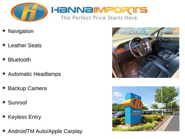Why shop with Hanna Imports? We specialize in hand-selecting top-quality used cars, trucks, and SUVs for drivers across Raleigh, Durham, Cary, Chapel Hill, and the greater Triangle area of North Carolina. Our massive selection of 1,000+ vehicles on our Raleigh lot is carefully curated to include the most sought-after models, all priced below market value. We believe in transparency and efficiency—our vehicles are aggressively priced from the start, which means no haggling, no hassle, and no wasted time. The price you see is our absolute best price. Whether you're coming from Wake Forest, Apex, Garner, or anywhere in central NC, we’re committed to making your car-buying experience smooth, affordable, and enjoyable. Come see why Hanna Imports is one of the most trusted used car dealerships in North Carolina! Used Tesla Model X in Raleigh. Used Tesla Model X in North Carolina, Model X Long Range, AWD, 6 Seat Interior, Exterior Parking Camera Rear, Power Liftgate, 17 Speakers, 4-Wheel Disc Brakes, 9.73 Axle Ratio, ABS brakes, Adaptive suspension, Air Conditioning, Alloy wheels, Auto High-beam Headlights, Auto tilt-away steering wheel, Auto-dimming door mirrors, Auto-dimming Rear-View mirror, Auto-leveling suspension, Automatic temperature control, Brake assist, Bumpers: body-color, Compass, Delay-off headlights, Door auto-latch, Driver door bin, Driver vanity mirror, Dual front impact airbags, Dual front side impact airbags, Electronic Stability Control, Four wheel independent suspension, Front anti-roll bar, Front Bucket Seats, Front Center Armrest, Front dual zone A/C, Front fog lights, Front reading lights, Fully automatic headlights, Garage door transmitter: Homelink, Genuine wood console insert, Genuine wood dashboard insert, Genuine wood door panel insert, Head restraints memory, Heated door mirrors, Heated front seats, Heated rear seats, Heated steering wheel, Illuminated entry, Knee airbag, Lane Departure Warning System, Leather steering wheel, Low tire pressure warning, Memory seat, Navigation System, Occupant sensing airbag, Outside temperature display, Overhead airbag, Passenger door bin, Passenger vanity mirror, Power adjustable front head restraints, Power door mirrors, Power driver seat, Power passenger seat, Power steering, Power windows, Premium Audio System, Premium Seat Trim, Radio data system, Rain sensing wipers, Rear anti-roll bar, Rear reading lights, Rear side impact airbag, Rear window defroster, Remote keyless entry, Security system, Speed control, Speed-sensing steering, Speed-Sensitive Wipers, Split folding rear seat, Spoiler, Sport steering wheel, Steering wheel memory, Steering wheel mounted A/C controls, Steering wheel mounted audio controls, Telescoping steering wheel, Tilt steering wheel, Traction control, Trip computer, Variably intermittent wipers, and Wheels: 20 Silver.