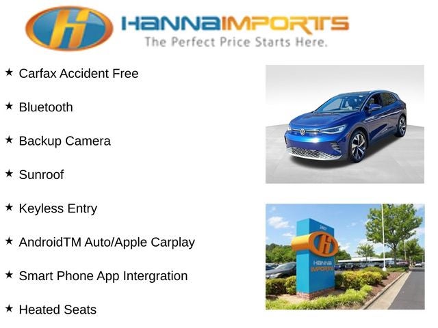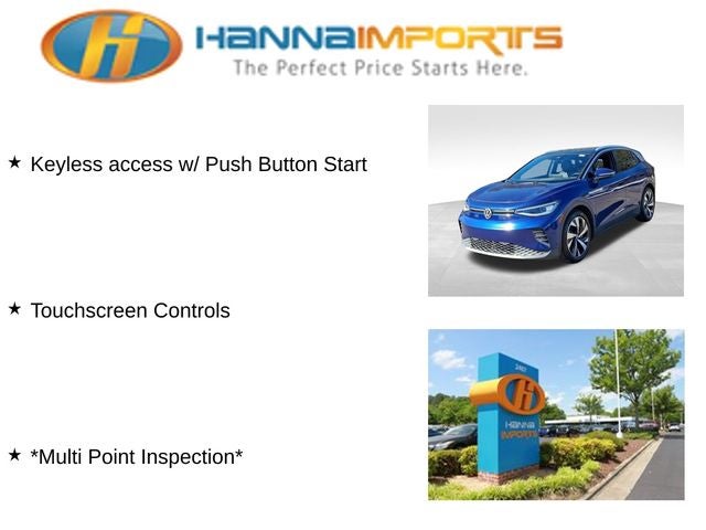 Why shop with Hanna Imports? We specialize in hand-selecting top-quality used cars, trucks, and SUVs for drivers across Raleigh, Durham, Cary, Chapel Hill, and the greater Triangle area of North Carolina. Our massive selection of 1,000+ vehicles on our Raleigh lot is carefully curated to include the most sought-after models, all priced below market value. We believe in transparency and efficiency—our vehicles are aggressively priced from the start, which means no haggling, no hassle, and no wasted time. The price you see is our absolute best price. Whether you're coming from Wake Forest, Apex, Garner, or anywhere in central NC, we’re committed to making your car-buying experience smooth, affordable, and enjoyable. Come see why Hanna Imports is one of the most trusted used car dealerships in North Carolina! Used Volkswagen ID.4 in Raleigh. Used Volkswagen ID.4 in North Carolina, ID.4 Pro S, 4 Wheel Independent Suspension, 4.39 Axle Ratio, 7 Speakers, ABS brakes, Air Conditioning, Alloy wheels, Auto High-beam Headlights, Auto-dimming Rear-View mirror, Automatic temperature control, Brake assist, Bumpers: body-color, Delay-off headlights, Driver door bin, Driver vanity mirror, Driver's Seat Mounted Armrest, Dual front impact airbags, Dual front side impact airbags, Electronic Stability Control, Emergency communication system: VW Car-Net services (capabilities require enrollment or subscription), Exterior Parking Camera Rear, Four wheel independent suspension, Front anti-roll bar, Front Bucket Seats, Front dual zone A/C, Front fog lights, Front reading lights, Fully automatic headlights, Heated door mirrors, Heated Front Seats, Heated front seats, Heated steering wheel, Illuminated entry, Low tire pressure warning, Memory seat, Navigation System, Occupant sensing airbag, Outside temperature display, Overhead airbag, Overhead console, Panic alarm, Passenger door bin, Passenger seat mounted armrest, Passenger vanity mirror, Perforated V-Tex Leatherette Seating Surfaces, Power door mirrors, Power driver seat, Power Liftgate, Power passenger seat, Power steering, Power windows, Radio data system, Radio: Discover Pro Max w/12 Touchscreen Nav, Rain sensing wipers, Rear anti-roll bar, Rear reading lights, Rear seat center armrest, Rear window defroster, Rear window wiper, Remote keyless entry, Roof rack: rails only, Speed control, Speed-sensing steering, Split folding rear seat, Spoiler, Steering wheel mounted audio controls, Telescoping steering wheel, Tilt steering wheel, Traction control, Trip computer, Turn signal indicator mirrors, Variably intermittent wipers, and Wheels: 19 5-Spoke 2-Tone Machined Alloy.