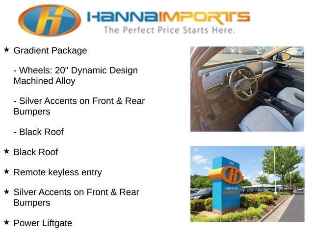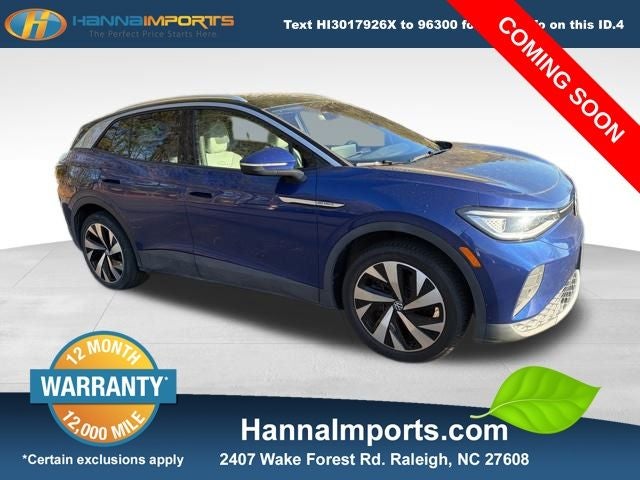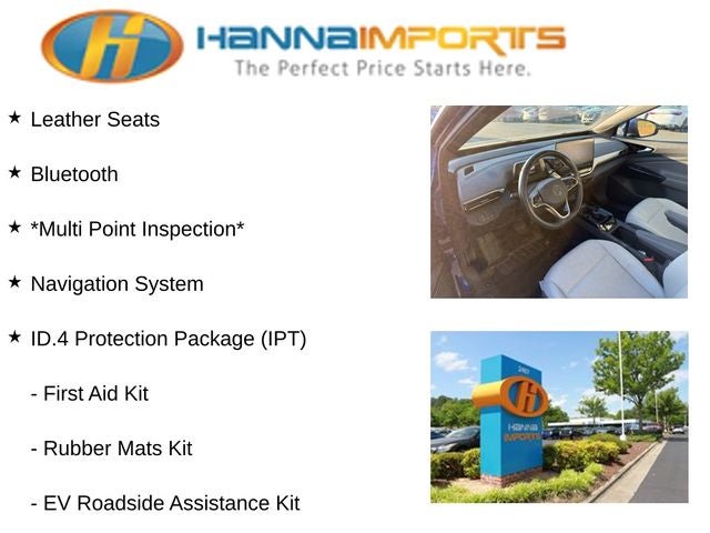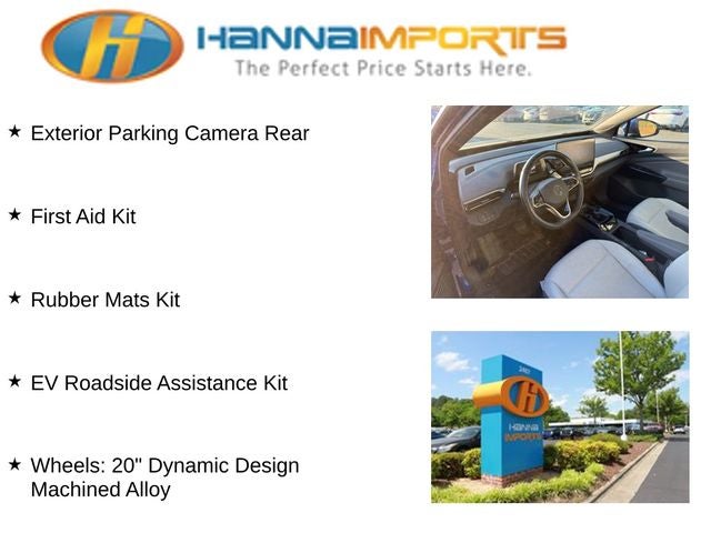 Why shop with Hanna Imports? We specialize in hand-selecting top-quality used cars, trucks, and SUVs for drivers across Raleigh, Durham, Cary, Chapel Hill, and the greater Triangle area of North Carolina. Our massive selection of 1,000+ vehicles on our Raleigh lot is carefully curated to include the most sought-after models, all priced below market value. We believe in transparency and efficiency—our vehicles are aggressively priced from the start, which means no haggling, no hassle, and no wasted time. The price you see is our absolute best price. Whether you're coming from Wake Forest, Apex, Garner, or anywhere in central NC, we’re committed to making your car-buying experience smooth, affordable, and enjoyable. Come see why Hanna Imports is one of the most trusted used car dealerships in North Carolina! Used Volkswagen ID.4 in Raleigh. Used Volkswagen ID.4 in North Carolina, Gradient Package (Black Roof, Silver Accents on Front & Rear Bumpers, and Wheels: 20 Dynamic Design Machined Alloy), ID.4 Protection Package (IPT) (EV Roadside Assistance Kit, First Aid Kit, Rubber Mats Kit, and Heavy Duty Trunk Liner w/VW CarGo Blocks), ID.4 Pro S, AWD, Exterior Parking Camera Rear, Navigation System, Power Liftgate, Remote keyless entry, 3.90 Axle Ratio, 4 Wheel Independent Suspension, 7 Speakers, ABS brakes, Air Conditioning, Alloy wheels, Auto High-beam Headlights, Auto-dimming Rear-View mirror, Automatic temperature control, Brake assist, Bumpers: body-color, Delay-off headlights, Driver door bin, Driver vanity mirror, Driver's Seat Mounted Armrest, Dual front impact airbags, Dual front side impact airbags, Electronic Stability Control, Emergency communication system: VW Car-Net services (capabilities require enrollment or subscription), Four wheel independent suspension, Front anti-roll bar, Front Bucket Seats, Front dual zone A/C, Front fog lights, Front reading lights, Fully automatic headlights, Heated door mirrors, Heated Front Seats, Heated front seats, Heated steering wheel, Illuminated entry, Low tire pressure warning, Memory seat, Occupant sensing airbag, Outside temperature display, Overhead airbag, Overhead console, Panic alarm, Passenger door bin, Passenger seat mounted armrest, Passenger vanity mirror, Perforated V-Tex Leatherette Seating Surfaces, Power door mirrors, Power driver seat, Power passenger seat, Power steering, Power windows, Radio data system, Radio: Discover Pro Max w/12 Touchscreen Nav, Rain sensing wipers, Rear anti-roll bar, Rear reading lights, Rear seat center armrest, Rear window defroster, Rear window wiper, Roof rack: rails only, Speed control, Speed-sensing steering, Split folding rear seat, Spoiler, Steering wheel mounted audio controls, Telescoping steering wheel, Tilt steering wheel, Traction control, Trip computer, Turn signal indicator mirrors, Variably intermittent wipers, and Wheels: 19 5-Spoke 2-Tone Machined Alloy.