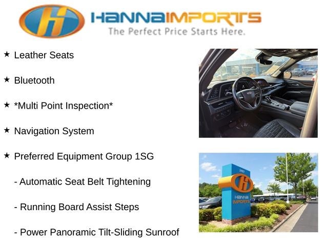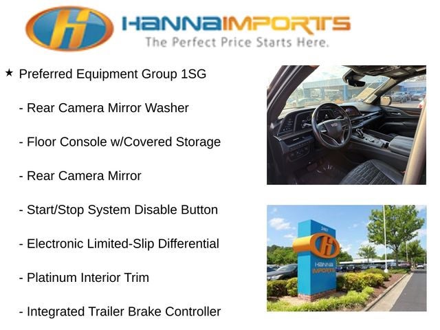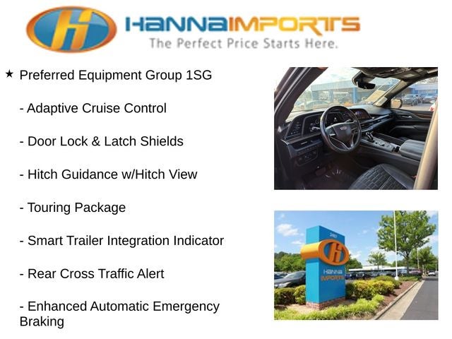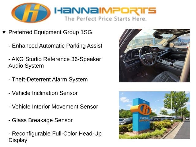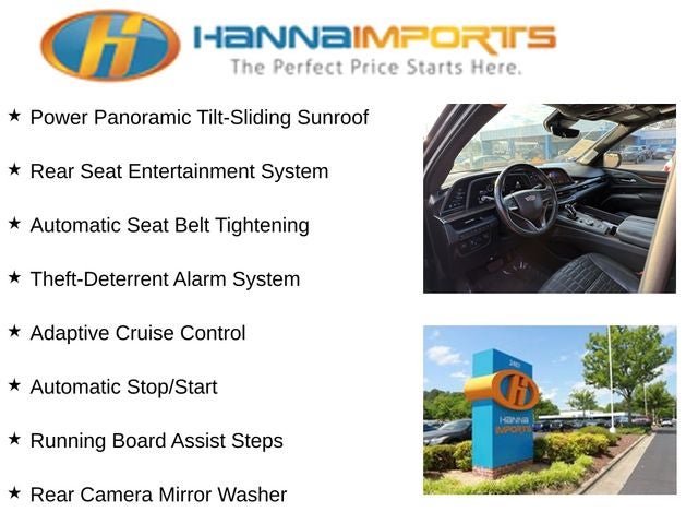 Why shop with Hanna Imports? We specialize in hand-selecting top-quality used cars, trucks, and SUVs for drivers across Raleigh, Durham, Cary, Chapel Hill, and the greater Triangle area of North Carolina. Our massive selection of 1,000+ vehicles on our Raleigh lot is carefully curated to include the most sought-after models, all priced below market value. We believe in transparency and efficiency—our vehicles are aggressively priced from the start, which means no haggling, no hassle, and no wasted time. The price you see is our absolute best price. Whether you're coming from Wake Forest, Apex, Garner, or anywhere in central NC, we’re committed to making your car-buying experience smooth, affordable, and enjoyable. Come see why Hanna Imports is one of the most trusted used car dealerships in North Carolina! Used Cadillac Escalade in Raleigh. Used Cadillac Escalade in North Carolina, Preferred Equipment Group 1SG (Adaptive Cruise Control, AKG Studio Reference 36-Speaker Audio System, Automatic Seat Belt Tightening, Automatic Stop/Start, Door Lock & Latch Shields, Electronic Limited-Slip Differential, Enhanced Automatic Emergency Braking, Enhanced Automatic Parking Assist, Floor Console w/Covered Storage, Glass Breakage Sensor, Hitch Guidance w/Hitch View, Integrated Trailer Brake Controller, Platinum Interior Trim, Power Panoramic Tilt-Sliding Sunroof, Rear Camera Mirror, Rear Camera Mirror Washer, Rear Cross Traffic Alert, Rear Seat Entertainment System, Reconfigurable Full-Color Head-Up Display, Reverse Automatic Braking, Running Board Assist Steps, Smart Trailer Integration Indicator, Start/Stop System Disable Button, Theft-Deterrent Alarm System, Trailer Side Blind Zone Alert, Vehicle Inclination Sensor, Vehicle Interior Movement Sensor, and Front Auxiliary 12-volt Power Outlet), Touring Package (Air Ride Adaptive Suspension, Illuminating Front & Rear Sill Plates, and Soft Closing Front & Rear Doors), Escalade Premium Luxury Platinum, 6.2L V8, 4WD, Jet Black Leather, Heated & Ventilated Driver & Front Passenger Seats, Navigation System, 16.9 Diagonal OLED Infotainment Screen, 2-Presets Memory For Driver Seat Adjuster, 3.23 Axle Ratio, 3rd row seats: split-bench, 4-Way Power Driver Lumbar Seat Adjuster, 4-Way Power Front Passenger Lumbar Seat Adjuster, 4-Wheel Disc Brakes, 8-Way Power Driver Seat Adjuster, 8-Way Power Front Passenger Seat Adjuster, A/V remote, ABS brakes, Adaptive suspension, Air Conditioning, Alloy wheels, AM/FM radio: SiriusXM with 360L, Apple CarPlay/Android Auto, Audio memory, Auto High-beam Headlights, Auto tilt-away steering wheel, Auto-dimming door mirrors, Auto-dimming Rear-View mirror, Automatic temperature control, Brake assist, Bumpers: body-color, Compass, Delay-off headlights, Door auto-latch, Driver door bin, Driver vanity mirro