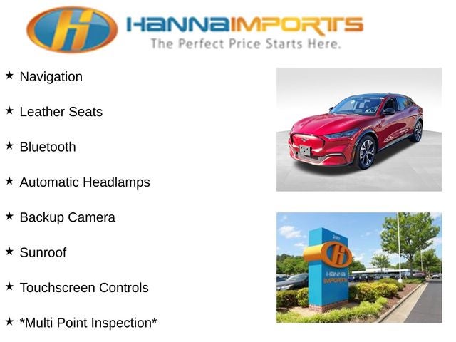 Why shop with Hanna Imports? We specialize in hand-selecting top-quality used cars, trucks, and SUVs for drivers across Raleigh, Durham, Cary, Chapel Hill, and the greater Triangle area of North Carolina. Our massive selection of 1,000+ vehicles on our Raleigh lot is carefully curated to include the most sought-after models, all priced below market value. We believe in transparency and efficiency—our vehicles are aggressively priced from the start, which means no haggling, no hassle, and no wasted time. The price you see is our absolute best price. Whether you're coming from Wake Forest, Apex, Garner, or anywhere in central NC, we’re committed to making your car-buying experience smooth, affordable, and enjoyable. Come see why Hanna Imports is one of the most trusted used car dealerships in North Carolina! Used Ford Mustang Mach-E in Raleigh. Used Ford Mustang Mach-E in North Carolina, Equipment Group 300A, Mustang Mach-E Premium, Apple CarPlay/Android Auto, Exterior Parking Camera Rear, Navigation system: Connected Navigation, Power Liftgate, 10 Speakers, 4-Wheel Disc Brakes, ABS brakes, Air Conditioning, Alloy wheels, AM/FM radio: SiriusXM with 360L, AM/FM Stereo, Auto High-beam Headlights, Auto-dimming Rear-View mirror, Automatic temperature control, Axle Ratio: 9.05, Brake assist, Bumpers: body-color, Compass, Delay-off headlights, Driver door bin, Driver vanity mirror, Dual front impact airbags, Dual front side impact airbags, Electronic Stability Control, Emergency communication system: 911 Assist, Four wheel independent suspension, Front anti-roll bar, Front Bucket Seats, Front Center Armrest, Front dual zone A/C, Front reading lights, Fully automatic headlights, Garage door transmitter, Heated door mirrors, Heated front seats, Heated Perforated ActiveX Bucket Seats, Heated steering wheel, Illuminated entry, Knee airbag, Low tire pressure warning, Memory seat, Occupant sensing airbag, Outside temperature display, Overhead airbag, Overhead console, Panic alarm, Passenger door bin, Passenger vanity mirror, Power door mirrors, Power driver seat, Power passenger seat, Power steering, Power windows, Radio data system, Rain sensing wipers, Rear anti-roll bar, Rear seat center armrest, Rear side impact airbag, Rear window defroster, Rear window wiper, Remote keyless entry, Security system, SiriusXM Radio w/360L, Speed control, Speed-sensing steering, Speed-Sensitive Wipers, Split folding rear seat, Spoiler, Steering wheel mounted audio controls, SYNC 4A w/Enhanced Voice Recognition, Telescoping steering wheel, Tilt steering wheel, Traction control, Trip computer, Turn signal indicator mirrors, Variably intermittent wipers, and Wheels: 19 Machined-Face Aluminum.