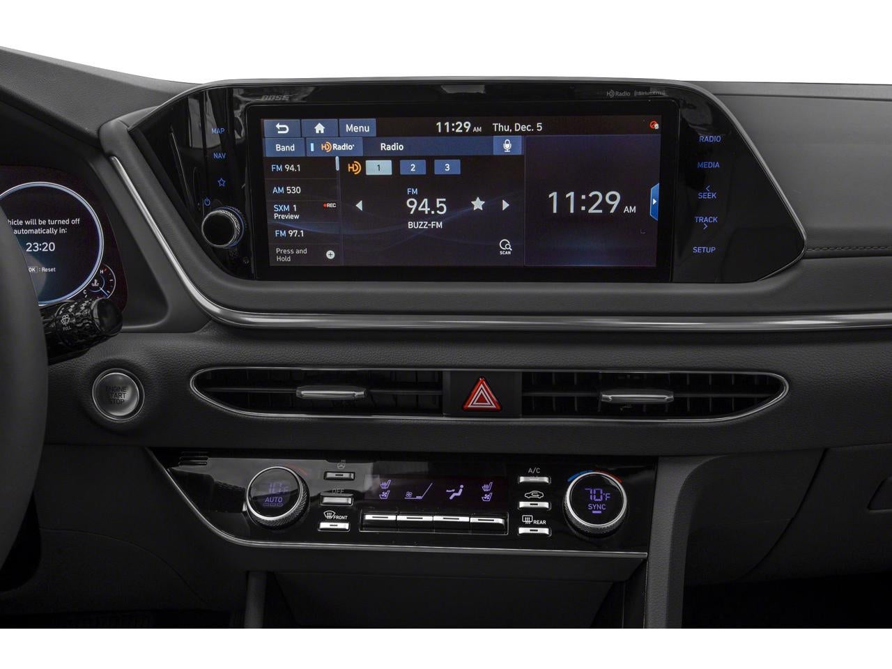 - Radio: AM/FM/MP3/HD/SiriusXM Display Audio w/Nav -inc: 10.25" color touchscreen, Bose premium audio w/12 speakers (1 center channel, 2 dash, 2 front tweeters, 4 door mounted, 2 rear mounted speakers plus 1 rear mounted subwoofer), dynamic voice recognition, integrated Bluetooth®, Blue Link connected car system, Apple CarPlay, Android Auto, USB, diversity antenna for navigation and HERE HD traffic