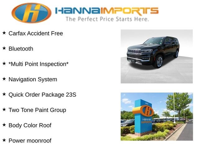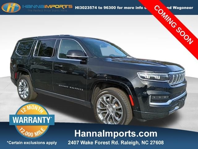 Why shop with Hanna Imports? We specialize in hand-selecting top-quality used cars, trucks, and SUVs for drivers across Raleigh, Durham, Cary, Chapel Hill, and the greater Triangle area of North Carolina. Our massive selection of 1,000+ vehicles on our Raleigh lot is carefully curated to include the most sought-after models, all priced below market value. We believe in transparency and efficiency—our vehicles are aggressively priced from the start, which means no haggling, no hassle, and no wasted time. The price you see is our absolute best price. Whether you're coming from Wake Forest, Apex, Garner, or anywhere in central NC, we’re committed to making your car-buying experience smooth, affordable, and enjoyable. Come see why Hanna Imports is one of the most trusted used car dealerships in North Carolina! Used Jeep Grand Wagoneer in Raleigh. Used Jeep Grand Wagoneer in North Carolina, Quick Order Package 23S, Two Tone Paint Group, Grand Wagoneer Series II, 6.4L V8, 4WD, Body Color Roof, Navigation System, Power Liftgate, Power moonroof, 19 Speakers, 3.92 Rear Axle Ratio, 3rd row seats: bench, 4-Wheel Disc Brakes, ABS brakes, Adjustable pedals, Air Conditioning, Alloy wheels, AM/FM radio: SiriusXM with 360L, Anti-whiplash front head restraints, Audio memory, Auto High-beam Headlights, Auto-dimming door mirrors, Auto-dimming Rear-View mirror, Auto-leveling suspension, Automatic temperature control, Brake assist, Bumpers: body-color, Compass, Delay-off headlights, Driver door bin, Driver vanity mirror, Driver's Seat Mounted Armrest, Dual front impact airbags, Dual front side impact airbags, Electronic Stability Control, Four wheel independent suspension, Front anti-roll bar, Front Bucket Seats, Front Center Armrest w/Storage, Front dual zone A/C, Front fog lights, Front Passenger Interactive Display, Front reading lights, Fully automatic headlights, Garage door transmitter, Genuine wood console insert, Genuine wood dashboard insert, Genuine wood door panel insert, Heads-Up Display, Heated door mirrors, Heated front seats, Heated rear seats, Heated steering wheel, Illuminated entry, Knee airbag, Leather steering wheel, Leather Trimmed Bucket Seats, Low tire pressure warning, Memory seat, Normal Duty Suspension, Occupant sensing airbag, Outside temperature display, Overhead airbag, Overhead console, Panic alarm, Passenger door bin, Passenger seat mounted armrest, Passenger vanity mirror, Pedal memory, Power adjustable front head restraints, Power door mirrors, Power driver seat, Power passenger seat, Power steering, Power windows, Radio data system, Radio: Uconnect 5 Nav w/12.0 Display, Rain sensing wipers, Rear air conditioning, Rear anti-roll bar, Rear dual zone A/C, Rear reading lights, Rear seat center armrest, Rear window defroster, Rear window wiper, Reclining 3rd row seat, Remote keyless entry, Security system, Speed control, Speed-sensing steering, Speed-Sensitive Wipers, Split folding rear seat, Steering wheel memory, Steering wheel mounted audio controls, Tachometer, Telescoping steering wheel, Tilt steering wheel, Traction control, Trip computer, Turn signal indicator mirrors, Variably intermittent wipers, Ventilated front seats, Voltmeter, Wheels: 22 x 9.0 Premium 1 Aluminum, and Wheels: 22 x 9.0 Premium 2 Aluminum.