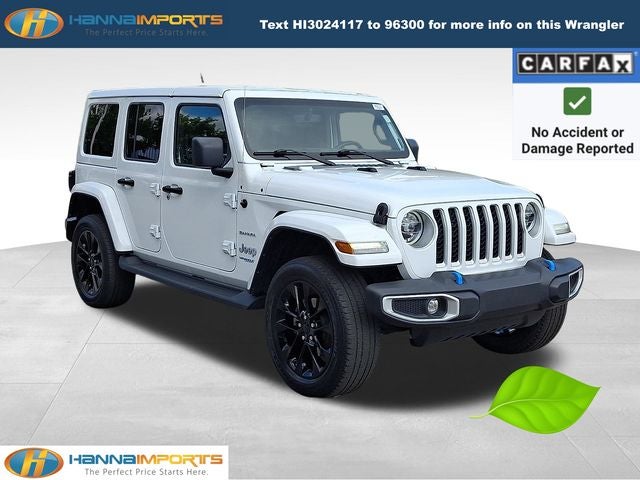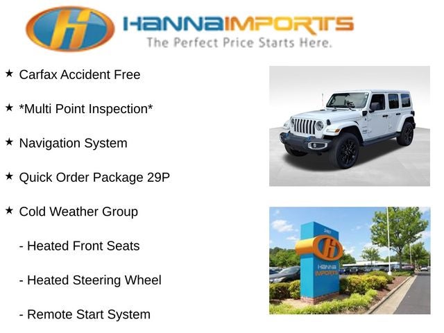 Why shop with Hanna Imports? We specialize in hand-selecting top-quality used cars, trucks, and SUVs for drivers across Raleigh, Durham, Cary, Chapel Hill, and the greater Triangle area of North Carolina. Our massive selection of 1,000+ vehicles on our Raleigh lot is carefully curated to include the most sought-after models, all priced below market value. We believe in transparency and efficiency—our vehicles are aggressively priced from the start, which means no haggling, no hassle, and no wasted time. The price you see is our absolute best price. Whether you're coming from Wake Forest, Apex, Garner, or anywhere in central NC, we’re committed to making your car-buying experience smooth, affordable, and enjoyable. Come see why Hanna Imports is one of the most trusted used car dealerships in North Carolina! Used Jeep Wrangler in Raleigh. Used Jeep Wrangler in North Carolina, Cold Weather Group (Heated Front Seats, Heated Steering Wheel, and Remote Start System), Quick Order Package 29P, Wrangler Unlimited Sahara 4xe, 2.0L I4 DOHC, Apple CarPlay/Android Auto, Body Color 3-Piece Hard Top, Freedom Panel Storage Bag, Navigation System, ParkView Rear Back-Up Camera, Rear Window Defroster, Rear Window Wiper/Washer, 3.73 Rear Axle Ratio, 4-Wheel Disc Brakes, 9 Speakers, ABS brakes, Air Conditioning, Alloy wheels, AM/FM radio, Auto-dimming Rear-View mirror, Automatic temperature control, Brake assist, Compass, Corning Gorilla Glass, Delay-off headlights, Driver door bin, Driver vanity mirror, Dual front impact airbags, Dual front side impact airbags, Electronic Stability Control, Emergency communication system: SiriusXM Guardian, Front anti-roll bar, Front Bucket Seats, Front Center Armrest w/Storage, Front dual zone A/C, Front fog lights, Front reading lights, Fully automatic headlights, Garage door transmitter, Heated door mirrors, Illuminated entry, Integrated roll-over protection, Leather Shift Knob, Leather steering wheel, Low tire pressure warning, MOPAR All-Weather Floor Mats, Occupant sensing airbag, Outside temperature display, Panic alarm, Passenger door bin, Passenger vanity mirror, Power door mirrors, Power steering, Power windows, Premium McKinley Trimmed Seats, Radio data system, Radio: Uconnect 4C Nav w/8.4 Display, Rear anti-roll bar, Rear reading lights, Rear seat center armrest, Remote keyless entry, Security system, Speed control, Split folding rear seat, Sport Suspension, Steering wheel mounted audio controls, Tachometer, Telescoping steering wheel, Tilt steering wheel, Traction control, Trip computer, Variably intermittent wipers, Voltmeter, and Wheels: 20 x 8 Fully Painted Aluminum.