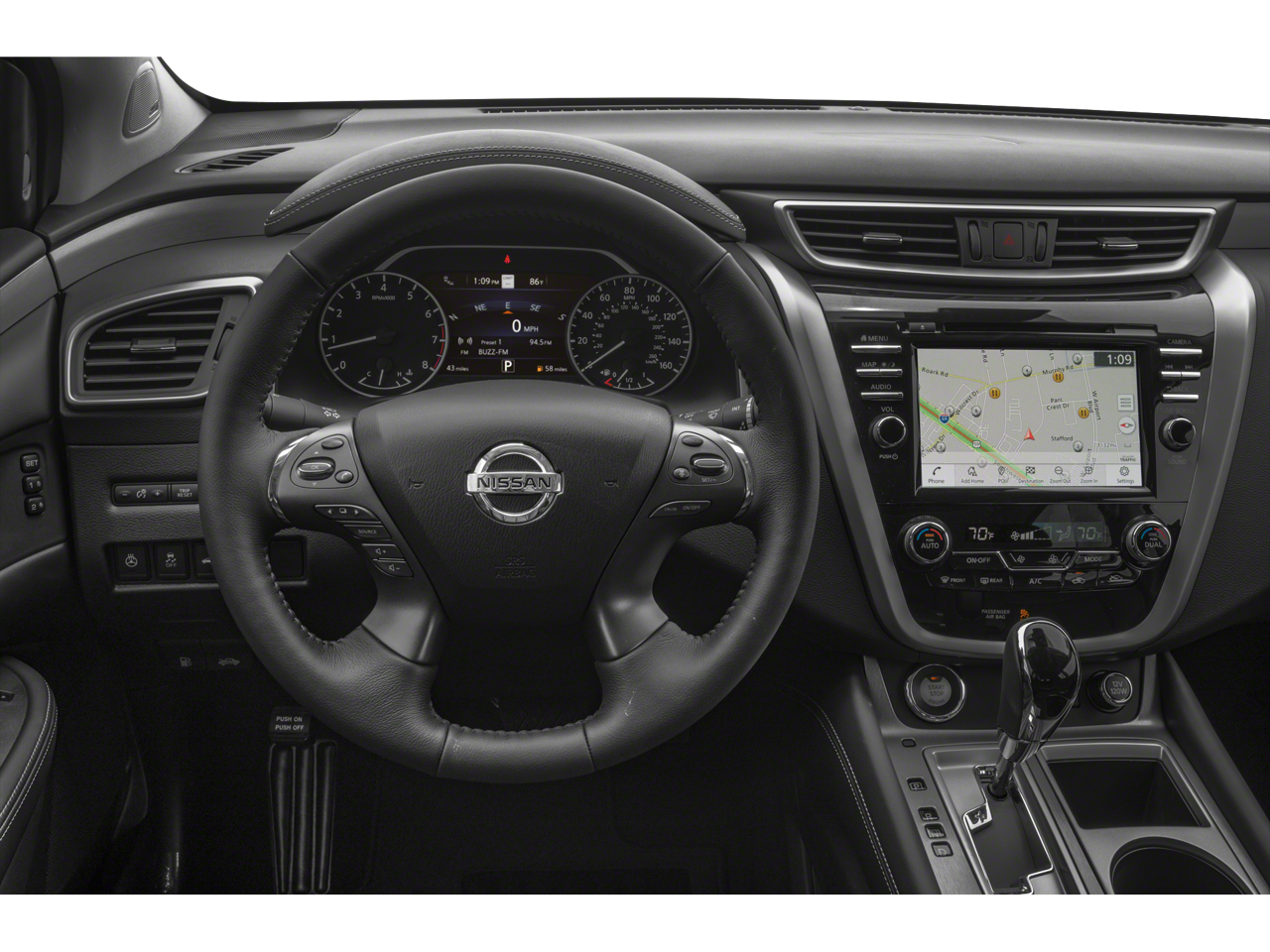 Equipped with Cargo Package (Cargo Area Protector, Cargo Net, First Aid Kit, and Retractable Cargo Cover), CVT with Xtronic, 11 Speakers, 4-Wheel Disc Brakes, 4.667 Axle Ratio, ABS brakes, Air Conditioning, Alloy wheels, AM/FM radio: SiriusXM, AM/FM/CD/MP3/WMA Audio System, Auto High-beam Headlights, Auto tilt-away steering wheel, Auto-dimming Rear-View mirror, Automatic temperature control, Blind Spot Warning, Brake assist, Bumpers: body-color, Carpeted Floor Mats & Carpeted Cargo Mat, CD player, Child-Seat-Sensing Airbag, Delay-off headlights, Driver door bin, Driver vanity mirror, Dual front impact airbags, Dual front side impact airbags, Electronic Stability Control, Emergency communication system: NissanConnect Services (first 6 months included), Exterior Parking Camera Rear, Four wheel independent suspension, Front anti-roll bar, Front Bucket Seats, Front Center Armrest, Front dual zone A/C, Front fog lights, Front reading lights, Fully automatic headlights, Garage door transmitter: HomeLink, Heated & Ventilated Front Bucket Seats, Heated door mirrors, Heated front seats, Heated rear seats, Heated steering wheel, Illuminated entry, Illuminated Kick Plates, Illuminated Kick Plates (PIO), Knee airbag, Low tire pressure warning, Memory seat, Navigation system: NissanConnect Navigation, NissanConnect featuring Apple CarPlay and Android Auto, NissanConnect Services Powered By SiriusXM, Occupant sensing airbag, Outside temperature display, Overhead airbag, Overhead console, Panic alarm, Passenger door bin, Passenger vanity mirror, Power door mirrors, Power driver seat, Power Liftgate, Power moonroof, Power passenger seat, Power steering, Power windows, Premium audio system: Bose, Radio data system, Rear anti-roll bar, Rear Bumper Protector, Rear reading lights, Rear seat center armrest, Rear side impact airbag, Rear window defroster, Rear window wiper, Remote keyless entry, Roof rack: rails only, Security system, Semi-Aniline Leather-Appointed Seat Trim, Speed control, Speed-sensing steering, Speed-Sensitive Wipers, Splash Guards (B92), Split folding rear seat, Spoiler, Steering wheel memory, Steering wheel mounted audio controls, Tachometer, Telescoping steering wheel, Tilt steering wheel, Traction control, Trip computer, Turn signal indicator mirrors, Variably intermittent wipers, Ventilated front seats, and Wheels: 20 Unique Dark Hyper Silver.