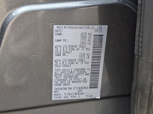 2022 Nissan Pathfinder SV Gun Metallic 21/27 City/Highway MPG