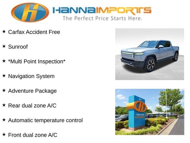 Why shop with Hanna Imports? We specialize in hand-selecting top-quality used cars, trucks, and SUVs for drivers across Raleigh, Durham, Cary, Chapel Hill, and the greater Triangle area of North Carolina. Our massive selection of 1,000+ vehicles on our Raleigh lot is carefully curated to include the most sought-after models, all priced below market value. We believe in transparency and efficiency—our vehicles are aggressively priced from the start, which means no haggling, no hassle, and no wasted time. The price you see is our absolute best price. Whether you're coming from Wake Forest, Apex, Garner, or anywhere in central NC, we’re committed to making your car-buying experience smooth, affordable, and enjoyable. Come see why Hanna Imports is one of the most trusted used car dealerships in North Carolina! Used Rivian R1T in Raleigh. Used Rivian R1T in North Carolina, Adventure Package, R1T Adventure, Electric ZEV 600hp, AWD, Alloy wheels, Automatic temperature control, Exterior Parking Camera Rear, Front dual zone A/C, Fully automatic headlights, Heated door mirrors, Heated front seats, Navigation System, Power door mirrors, Rear dual zone A/C, Security system, Ventilated front seats, 19 Speakers, 4-Wheel Disc Brakes, ABS brakes, Adaptive suspension, Air Conditioning, Audio memory, Auto High-beam Headlights, Auto tilt-away steering wheel, Auto-dimming door mirrors, Auto-dimming Rear-View mirror, Auto-leveling suspension, Brake assist, Delay-off headlights, Driver door bin, Driver vanity mirror, Dual front impact airbags, Dual front side impact airbags, Electronic Stability Control, Emergency communication system, Four wheel independent suspension, Front anti-roll bar, Front Bucket Seats, Front Center Armrest, Front fog lights, Front reading lights, Genuine wood console insert, Genuine wood dashboard insert, Genuine wood door panel insert, Heated & Ventilated Front Bucket Seats, Heated steering wheel, Illuminated entry, Knee airbag, Low tire pressure warning, Memory seat, Occupant sensing airbag, Outside temperature display, Overhead airbag, Panic alarm, Passenger door bin, Passenger vanity mirror, Perf Vegan Leather Seat Trim w/Patterned Stitching, Power driver seat, Power passenger seat, Power steering, Power windows, Radio: Rivian Elevation Audio by Meridian, Rain sensing wipers, Rear air conditioning, Rear anti-roll bar, Rear audio controls, Rear fog lights, Rear reading lights, Rear seat center armrest, Rear window defroster, Remote keyless entry, Speed control, Speed-sensing steering, Split folding rear seat, Spoiler, Steering wheel memory, Steering wheel mounted audio controls, Telescoping steering wheel, Tilt steering wheel, Traction control, Trip computer, Turn signal indicator mirrors, Variably intermittent wipers, and Wheels: 21 Road Machined Aluminum.