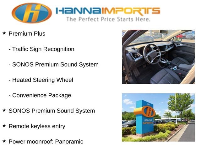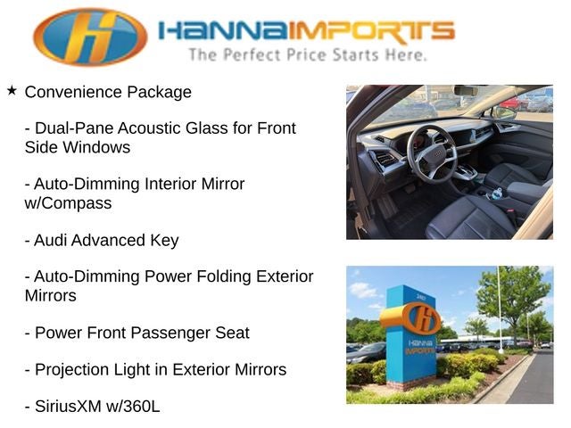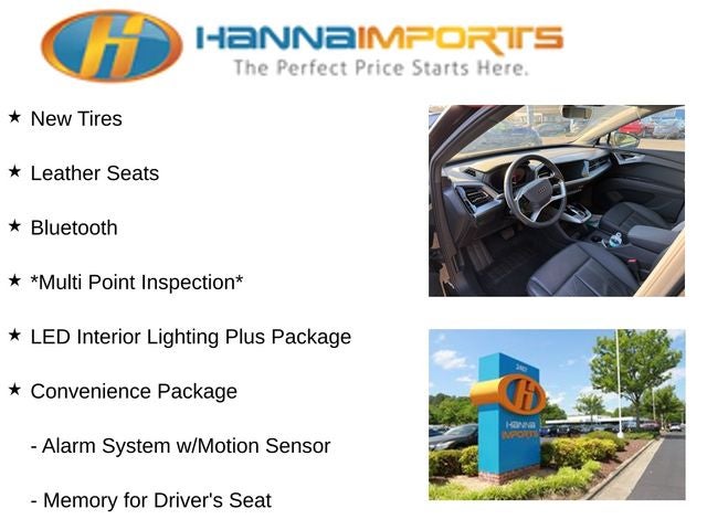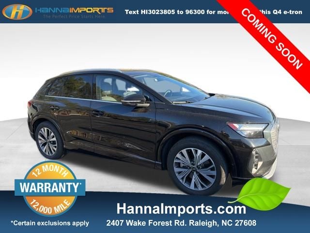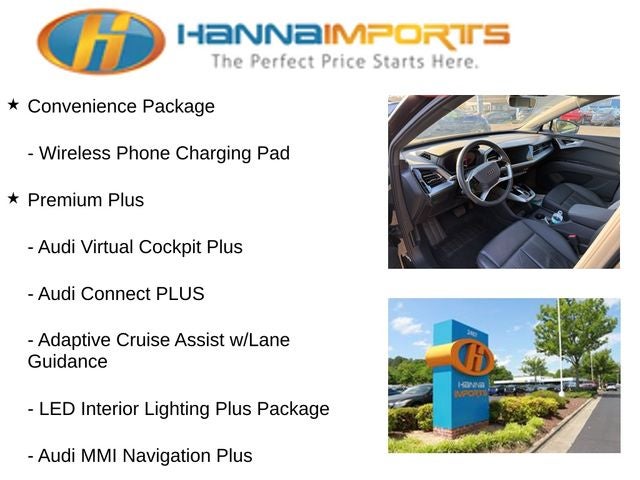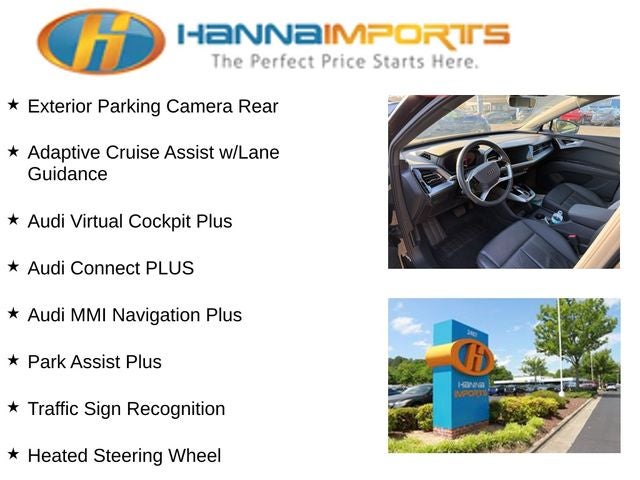 Why shop with Hanna Imports? We specialize in hand-selecting top-quality used cars, trucks, and SUVs for drivers across Raleigh, Durham, Cary, Chapel Hill, and the greater Triangle area of North Carolina. Our massive selection of 1,000+ vehicles on our Raleigh lot is carefully curated to include the most sought-after models, all priced below market value. We believe in transparency and efficiency—our vehicles are aggressively priced from the start, which means no haggling, no hassle, and no wasted time. The price you see is our absolute best price. Whether you're coming from Wake Forest, Apex, Garner, or anywhere in central NC, we’re committed to making your car-buying experience smooth, affordable, and enjoyable. Come see why Hanna Imports is one of the most trusted used car dealerships in North Carolina! Used Audi Q4 e-tron in Raleigh. Used Audi Q4 e-tron in North Carolina, Convenience Package, LED Interior Lighting Plus Package, Premium Plus (Adaptive Cruise Assist w/Lane Guidance, Audi Connect PLUS, Audi MMI Navigation Plus, Audi Virtual Cockpit Plus, Heated Steering Wheel, Park Assist Plus, SONOS Premium Sound System, and Traffic Sign Recognition), Q4 e-tron Premium Plus, Exterior Parking Camera Rear, Power Liftgate, Power moonroof: Panoramic, Remote keyless entry, 8 Speakers, ABS brakes, Air Conditioning, Alloy wheels, Auto High-beam Headlights, Automatic temperature control, Brake assist, Bumpers: body-color, Delay-off headlights, Driver door bin, Driver vanity mirror, Dual front impact airbags, Dual front side impact airbags, Electronic Stability Control, Emergency communication system: Audi connect CARE, Four wheel independent suspension, Front anti-roll bar, Front Bucket Seats, Front Center Armrest, Front dual zone A/C, Front reading lights, Fully automatic headlights, Genuine wood dashboard insert, Heated door mirrors, Heated Front Seats, Heated front seats, Illuminated entry, Leather Seating Surfaces, Leather steering wheel, Low tire pressure warning, Occupant sensing airbag, Outside temperature display, Overhead airbag, Overhead console, Panic alarm, Passenger door bin, Passenger vanity mirror, Power door mirrors, Power driver seat, Power steering, Power windows, Radio data system, Radio: Audi Sound System, Rain sensing wipers, Rear air conditioning, Rear anti-roll bar, Rear reading lights, Rear seat center armrest, Rear window defroster, Rear window wiper, Security system, Speed control, Speed-sensing steering, Split folding rear seat, Spoiler, Steering wheel mounted audio controls, TBD Axle Ratio, Telescoping steering wheel, Tilt steering wheel, Traction control, Trip computer, Turn signal indicator mirrors, Variably intermittent wipers, and Wheels: 19 5-W-Spoke Aero Design.