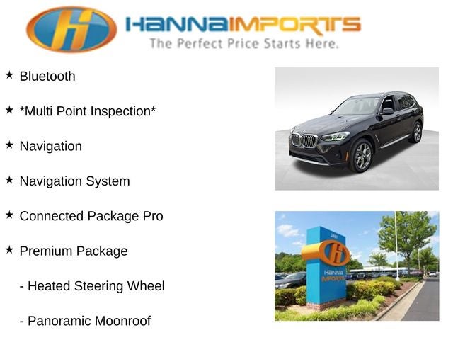 Why shop with Hanna Imports? We specialize in hand-selecting top-quality used cars, trucks, and SUVs for drivers across Raleigh, Durham, Cary, Chapel Hill, and the greater Triangle area of North Carolina. Our massive selection of 1,000+ vehicles on our Raleigh lot is carefully curated to include the most sought-after models, all priced below market value. We believe in transparency and efficiency—our vehicles are aggressively priced from the start, which means no haggling, no hassle, and no wasted time. The price you see is our absolute best price. Whether you're coming from Wake Forest, Apex, Garner, or anywhere in central NC, we’re committed to making your car-buying experience smooth, affordable, and enjoyable. Come see why Hanna Imports is one of the most trusted used car dealerships in North Carolina! Used BMW X3 in Raleigh. Used BMW X3 in North Carolina, Connected Package Pro, Premium Package (Driver Lumbar Support, Heated Front Seats, Heated Steering Wheel, Live Cockpit Pro w/Navigation, and Panoramic Moonroof), 8-Speed Automatic Sport, Apple CarPlay & Android Auto Compatibility, Exterior Parking Camera Rear, Navigation, Navigation System, Power Liftgate, Remote keyless entry, 12 Speakers, 3.385 Axle Ratio, 4-Wheel Disc Brakes, ABS brakes, Air Conditioning, Alloy wheels, AM/FM Radio, AM/FM radio: SiriusXM, Auto High-beam Headlights, Auto-dimming door mirrors, Auto-dimming Rear-View mirror, Automatic temperature control, BMW Assist eCall, BMW TeleServices, Brake assist, Bumpers: body-color, ConnectedDrive Services, Delay-off headlights, Driver door bin, Driver vanity mirror, Dual front impact airbags, Dual front side impact airbags, Electronic Stability Control, Emergency communication system: BMW Assist eCall, Enhanced USB & Bluetooth® w/Smartphone Integration, Four wheel independent suspension, Front anti-roll bar, Front Bucket Seats, Front Center Armrest, Front dual zone A/C, Front reading lights, Fully automatic headlights, Garage door transmitter, Genuine wood dashboard insert, Genuine wood door panel insert, Heated door mirrors, Hi-Fi Sound System, Illuminated entry, Knee airbag, Low tire pressure warning, Memory seat, Occupant sensing airbag, Outside temperature display, Overhead airbag, Panic alarm, Passenger door bin, Passenger vanity mirror, Perforated SensaTec Upholstery, Power door mirrors, Power driver seat, Power Front Seats, Power passenger seat, Power steering, Power windows, Radio data system, Rain sensing wipers, Rear air conditioning, Rear anti-roll bar, Rear reading lights, Rear seat center armrest, Rear window defroster, Rear window wiper, Remote Engine Start, Security system, SiriusXM Satellite Radio, Speed control, Speed-sensing steering, Speed-Sensitive Wipers, Split folding rear seat, Spoiler, Sport Seats, Sport steering wheel, Steering wheel mounted audio controls, Tachometer, Telescoping steering wheel, Tilt steering wheel, Traction control, Trip computer, Turn signal indicator mirrors, Variably intermittent wipers, Wheels: 19 x 7.5 Y-Spoke (Style 693), WiFi Hotspot, and Wireless Charging.
