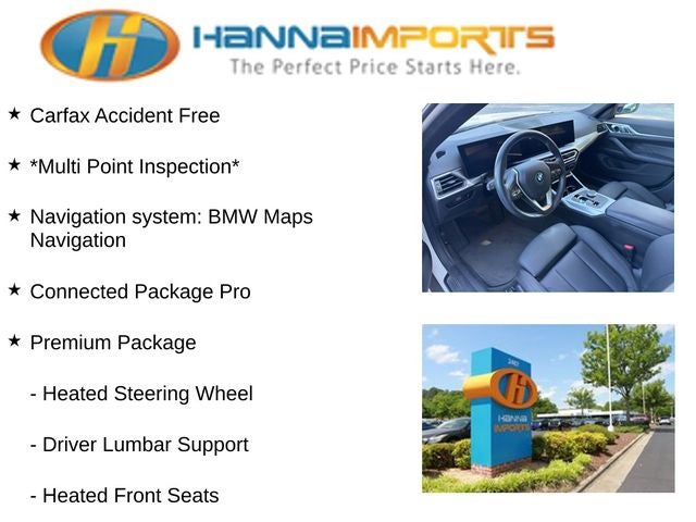 Why shop with Hanna Imports? We specialize in hand-selecting top-quality used cars, trucks, and SUVs for drivers across Raleigh, Durham, Cary, Chapel Hill, and the greater Triangle area of North Carolina. Our massive selection of 1,000+ vehicles on our Raleigh lot is carefully curated to include the most sought-after models, all priced below market value. We believe in transparency and efficiency—our vehicles are aggressively priced from the start, which means no haggling, no hassle, and no wasted time. The price you see is our absolute best price. Whether you're coming from Wake Forest, Apex, Garner, or anywhere in central NC, we’re committed to making your car-buying experience smooth, affordable, and enjoyable. Come see why Hanna Imports is one of the most trusted used car dealerships in North Carolina! Used BMW i4 in Raleigh. Used BMW i4 in North Carolina, Connected Package Pro, Premium Package (Ambient Lighting, Driver Lumbar Support, Heated Front Seats, Heated Steering Wheel, and Iconic Sounds Electric), i4 eDrive35, Alpine White, Apple CarPlay & Android Auto Compatibility, Exterior Parking Camera Rear, Navigation system: BMW Maps Navigation, Power Liftgate, Power moonroof, Remote keyless entry, 10 Speakers, 4-Wheel Disc Brakes, ABS brakes, Air Conditioning, Alloy wheels, Auto High-beam Headlights, Auto-dimming door mirrors, Auto-dimming Rear-View mirror, Auto-leveling suspension, Automatic temperature control, BMW Assist eCall, BMW Curved Display, BMW TeleServices, Brake assist, Bumpers: body-color, Compass, ConnectedDrive Services, Delay-off headlights, Driver door bin, Driver vanity mirror, Dual front impact airbags, Dual front side impact airbags, Electronic Stability Control, Emergency communication system: BMW Assist eCall, Four wheel independent suspension, Front anti-roll bar, Front Bucket Seats, Front Center Armrest, Front dual zone A/C, Front reading lights, Fully automatic headlights, Garage door transmitter, Heated door mirrors, Hi-Fi Sound System, Illuminated entry, Leather steering wheel, Low tire pressure warning, Memory seat, Occupant sensing airbag, Outside temperature display, Overhead airbag, Overhead console, Panic alarm, Passenger door bin, Passenger vanity mirror, Perforated Sensatec Upholstery, Power door mirrors, Power driver seat, Power Front Seats, Power passenger seat, Power steering, Power windows, Radio data system, Radio: FM Audio System, Rain sensing wipers, Rear air conditioning, Rear anti-roll bar, Rear reading lights, Rear seat center armrest, Rear window defroster, Security system, SiriusXM Satellite Radio w/1 Year Subscription, Speed control, Speed-sensing steering, Speed-Sensitive Wipers, Split folding rear seat, Sport Seats, Sport steering wheel, Steering wheel mounted audio controls, Telescoping steering wheel, Tilt steering wheel, Traction control, Trip computer, Turn signal indicator mirrors, Variably intermittent wipers, and Wheels: 18 x 7.5 Gunmetal Grey Aero.