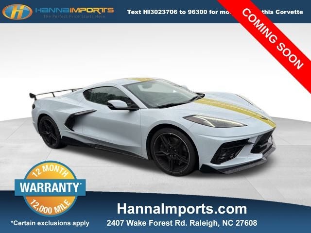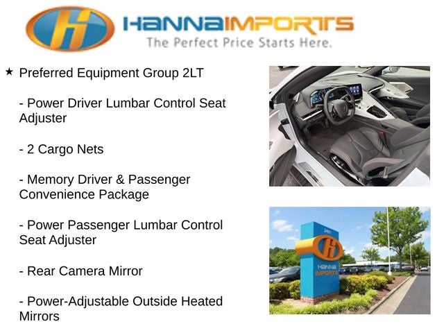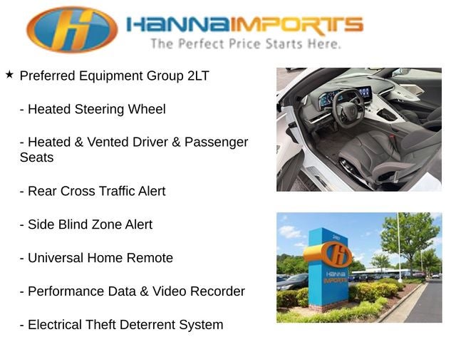 Why shop with Hanna Imports? We specialize in hand-selecting top-quality used cars, trucks, and SUVs for drivers across Raleigh, Durham, Cary, Chapel Hill, and the greater Triangle area of North Carolina. Our massive selection of 1,000+ vehicles on our Raleigh lot is carefully curated to include the most sought-after models, all priced below market value. We believe in transparency and efficiency—our vehicles are aggressively priced from the start, which means no haggling, no hassle, and no wasted time. The price you see is our absolute best price. Whether you're coming from Wake Forest, Apex, Garner, or anywhere in central NC, we’re committed to making your car-buying experience smooth, affordable, and enjoyable. Come see why Hanna Imports is one of the most trusted used car dealerships in North Carolina! Used Chevrolet Corvette in Raleigh. Used Chevrolet Corvette in North Carolina, Battery Protection Package, Memory Driver & Passenger Convenience Package, Preferred Equipment Group 2LT (2 Cargo Nets, Driver Power Bolster Seat Adjuster, Electrical Theft Deterrent System, HD Front & Rear Vision Cameras, Head-Up Display, Heated & Vented Driver & Passenger Seats, Heated Steering Wheel, Passenger Power Bolster Seat Adjuster, Performance Data & Video Recorder, Power Driver Lumbar Control Seat Adjuster, Power Passenger Lumbar Control Seat Adjuster, Power-Adjustable Outside Heated Mirrors, Rear Camera Mirror, Rear Cross Traffic Alert, Side Blind Zone Alert, Universal Home Remote, Vehicle Inclination Theft Deterrent Sensor, Vehicle Interior Movement Theft Deterrent Sensor, and Wireless Charging for Devices), Z51 Performance Package (Electronic Limited-Slip Differential, Heavy-Duty Cooling System, Performance Exhaust w/Stainless-Steel Tips, Performance Rear Axle Ratio, Rear Z51 Spoiler, Z51 Performance Brakes, and Z51 Performance Suspension), Corvette Stingray 2LT, Navigation System, Performance Traction Management, Z51 Perf Suspension w/Magnetic Selective Ride Cntrl, 14 Speakers, 4-Wheel Disc Brakes, 8-Way Power Driver Seat Adjuster, 8-Way Power Passenger Seat Adjuster, ABS brakes, Air Conditioning, Alloy wheels, AM/FM radio: SiriusXM, Apple CarPlay/Android Auto, Auto-dimming door mirrors, Auto-dimming Rear-View mirror, Automatic Leveling System Headlamp Control, Automatic temperature control, Black Custom Splash Guards (LPO), Body-Color Removable Roof Panel, Bose Performance Series Sound System w/14 Speakers, Brake assist, Bumpers: body-color, Compass, Competition Sport Bucket Seats, Delay-off headlights, Driver door bin, Driver vanity mirror, Dual front impact airbags, Dual front side impact airbags, Edge Yellow Full Length Dual Racing St
