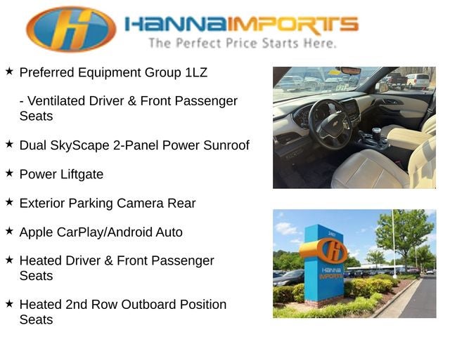 Why shop with Hanna Imports? We specialize in hand-selecting top-quality used cars, trucks, and SUVs for drivers across Raleigh, Durham, Cary, Chapel Hill, and the greater Triangle area of North Carolina. Our massive selection of 1,000+ vehicles on our Raleigh lot is carefully curated to include the most sought-after models, all priced below market value. We believe in transparency and efficiency—our vehicles are aggressively priced from the start, which means no haggling, no hassle, and no wasted time. The price you see is our absolute best price. Whether you're coming from Wake Forest, Apex, Garner, or anywhere in central NC, we’re committed to making your car-buying experience smooth, affordable, and enjoyable. Come see why Hanna Imports is one of the most trusted used car dealerships in North Carolina! Used Chevrolet Traverse in Raleigh. Used Chevrolet Traverse in North Carolina, Preferred Equipment Group 1LZ (Heated 2nd Row Outboard Position Seats, Heated Driver & Front Passenger Seats, and Ventilated Driver & Front Passenger Seats), Traverse Premier, AWD, Apple CarPlay/Android Auto, Dual SkyScape 2-Panel Power Sunroof, Exterior Parking Camera Rear, Navigation System, Power Liftgate, 10 Speakers, 3.49 Axle Ratio, 3rd row seats: split-bench, 4-Wheel Disc Brakes, 6-Way Power Front Passenger Seat, 8-Way Power Driver Seat Adjuster, ABS brakes, Air Conditioning, Alloy wheels, AM/FM radio: SiriusXM with 360L, Auto High-beam Headlights, Auto-dimming door mirrors, Auto-dimming Rear-View mirror, Automatic temperature control, Bose Premium 10-Speaker Audio System Feature, Brake assist, Bumpers: body-color, Compass, Delay-off headlights, Driver door bin, Driver vanity mirror, Dual front impact airbags, Dual front side impact airbags, Electronic Stability Control, Emergency communication system, Four wheel independent suspension, Front anti-roll bar, Front Bucket Seats, Front Center Armrest, Front dual zone A/C, Front Passenger 2-Way Power Lumbar, Front reading lights, Fully automatic headlights, Garage door transmitter, Heated door mirrors, Heated front seats, Heated rear seats, Heated steering wheel, Illuminated entry, Leather steering wheel, Low tire pressure warning, Memory seat, Not Equip w/Ventilated Seat Cushion Blower Motor, Not Equipped w/Hood Insulator, Occupant sensing airbag, Outside temperature display, Overhead airbag, Overhead console, Panic alarm, Passenger door bin, Passenger vanity mirror, Perforated Leather-Appointed Seat Trim, Power door mirrors, Power Driver Lumbar Control, Power driver seat, Power passenger seat, Power steering, Power windows, Premium audio system: Chevrolet Infotainment 3 Plus, Radio data system, Radio: Chevrolet Infotainment 3 Plus System w/Navi, Rear air conditioning, Rear anti-roll bar, Rear reading lights, Rear window defroster, Rear window wiper, Remote keyless entry, Security system, SiriusXM w/360L, Speed control, Speed-sensing steering, Spoiler, Steering wheel memory, Steering wheel mounted audio controls, Tachometer, Telescoping steering wheel, Tilt steering wheel, Traction control, Trip computer, Turn signal indicator mirrors, Variably intermittent wipers, Ventilated front seats, Voltmeter, and Wheels: 20 Metallic Machined-Face Aluminum.