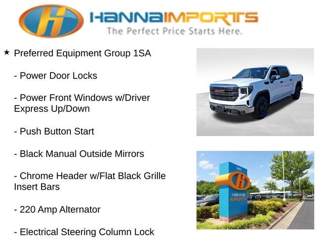 Why shop with Hanna Imports? We specialize in hand-selecting top-quality used cars, trucks, and SUVs for drivers across Raleigh, Durham, Cary, Chapel Hill, and the greater Triangle area of North Carolina. Our massive selection of 1,000+ vehicles on our Raleigh lot is carefully curated to include the most sought-after models, all priced below market value. We believe in transparency and efficiency—our vehicles are aggressively priced from the start, which means no haggling, no hassle, and no wasted time. The price you see is our absolute best price. Whether you're coming from Wake Forest, Apex, Garner, or anywhere in central NC, we’re committed to making your car-buying experience smooth, affordable, and enjoyable. Come see why Hanna Imports is one of the most trusted used car dealerships in North Carolina! Used GMC Sierra 1500 in Raleigh. Used GMC Sierra 1500 in North Carolina, 1SA Safety Plus Package (Chrome Mirror Caps, Lane Change Alert w/Side Blind Zone Alert, Perimeter Lighting, Rear Cross Traffic Braking, Rear Pedestrian Detection, and Ultrasonic Rear Park Assist), Convenience Package (Cruise Control, Deep-Tinted Glass, Electric Rear-Window Defogger, EZ Lift Power Lock & Release Tailgate, Heated Power-Adjustable Outside Mirrors, and LED Cargo Area Lighting), Preferred Equipment Group 1SA (2 Charge/Data USB Ports, 220 Amp Alternator, Black Manual Outside Mirrors, Chrome Header w/Flat Black Grille Insert Bars, Electrical Steering Column Lock, Front Frame-Mounted Black Recovery Hooks, HD Rear Vision Camera, Power Door Locks, Power Front Windows w/Driver Express Up/Down, Power Front Windows w/Passenger Express Down, Power Rear Windows w/Express Down, Push Button Start, Remote Keyless Entry, and Solar Absorbing Tinted Glass), Pro Value Package, Standard Suspension Package, Trailering Package (Hitch Guidance), Sierra 1500 Pro, 8-Speed Automatic, 4WD, Black Cloth, Apple CarPlay/Android Auto, 120-Volt Bed Mounted Power Outlet, 120-Volt Instrument Panel Power Outlet, 2 Type-C Charge-Only Rear USB Ports, 3.42 Rear Axle Ratio, 4-Way Manual Driver Seat Adjuster, 4-Way Manual Passenger Seat Adjuster, 4-Wheel Disc Brakes, 6 Speakers, 6-Speaker Audio System Feature, ABS brakes, Air Conditioning, AM/FM radio, Auto High-beam Headlights, Auto-Locking Rear Differential, Automatic Emergency Braking, Black Assist Steps, Brake assist, Buckle to Drive, Bumpers: chrome, Delay-off headlights, Driver door bin, Dual front impact airbags, Dual front side impact airbags, Electronic Stability Control, Engine Block Heater, Following Distance Indicator, Forward Collision Alert, Front 40/20/40 Split-Bench Seat, Front anti-roll bar, Front Center Armrest w/Storage, Front License Plate Kit, Front Pedestrian Braking, Front reading lights, Front wheel independent suspension, Fully automatic headlights, Illuminated entry, In