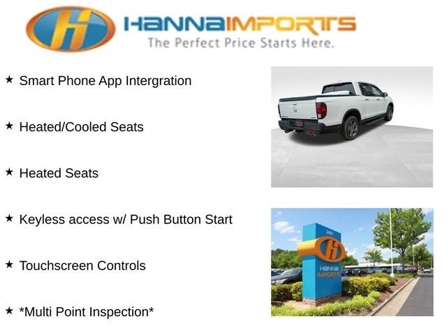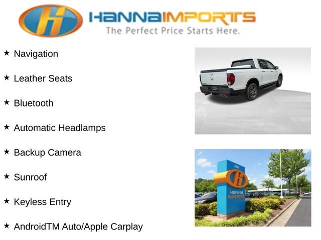 Why shop with Hanna Imports? We specialize in hand-selecting top-quality used cars, trucks, and SUVs for drivers across Raleigh, Durham, Cary, Chapel Hill, and the greater Triangle area of North Carolina. Our massive selection of 1,000+ vehicles on our Raleigh lot is carefully curated to include the most sought-after models, all priced below market value. We believe in transparency and efficiency—our vehicles are aggressively priced from the start, which means no haggling, no hassle, and no wasted time. The price you see is our absolute best price. Whether you're coming from Wake Forest, Apex, Garner, or anywhere in central NC, we’re committed to making your car-buying experience smooth, affordable, and enjoyable. Come see why Hanna Imports is one of the most trusted used car dealerships in North Carolina! Used Honda Ridgeline in Raleigh. Used Honda Ridgeline in North Carolina, Ridgeline RTL-E, Black w/Leather Seat Trim, 4-Wheel Disc Brakes, 4.33 Axle Ratio, 8 Speakers, ABS brakes, Air Conditioning, Alloy wheels, AM/FM radio: SiriusXM, Apple CarPlay/Android Auto, Auto High-beam Headlights, Auto-dimming Rear-View mirror, Automatic temperature control, Blind Spot Information (BSI) System warning, Bluetooth® Hands-Free Link, Brake assist, Bumpers: body-color, Compass, Delay-off headlights, Driver door bin, Driver vanity mirror, Driver's Seat Mounted Armrest, Dual front impact airbags, Dual front side impact airbags, Electronic Stability Control, Exterior Parking Camera Rear, Four wheel independent suspension, Front anti-roll bar, Front Bucket Seats, Front dual zone A/C, Front fog lights, Front reading lights, Fully automatic headlights, Garage door transmitter: HomeLink, Heated door mirrors, Heated Front Bucket Seats, Heated front seats, Heated steering wheel, Honda Satellite-Linked Navigation System, Illuminated entry, Leather Seat Trim, Low tire pressure warning, Memory seat, Navigation system: Honda Satellite-Linked Navigation System, Occupant sensing airbag, Outside temperature display, Overhead airbag, Overhead console, Panic alarm, Passenger door bin, Passenger seat mounted armrest, Passenger vanity mirror, Power door mirrors, Power driver seat, Power moonroof, Power passenger seat, Power steering, Power windows, Radio data system, Radio: 540-Watt Premium Audio System w/8 Speakers, Rear air conditioning, Rear anti-roll bar, Rear reading lights, Rear seat center armrest, Rear step bumper, Rear window defroster, Remote keyless entry, Security system, SiriusXM, Speed control, Speed-sensing steering, Split folding rear seat, Steering wheel mounted audio controls, Tachometer, Telescoping steering wheel, Tilt steering wheel, Traction control, Trip computer, Turn signal indicator mirrors, Variably intermittent wipers, and Wheels: 18 Exclusive Pewter Gray Alloy.