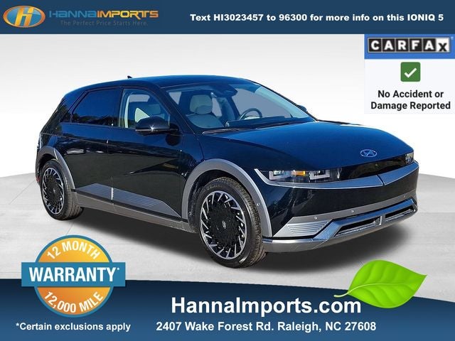 Why shop with Hanna Imports? We specialize in hand-selecting top-quality used cars, trucks, and SUVs for drivers across Raleigh, Durham, Cary, Chapel Hill, and the greater Triangle area of North Carolina. Our massive selection of 1,000+ vehicles on our Raleigh lot is carefully curated to include the most sought-after models, all priced below market value. We believe in transparency and efficiency—our vehicles are aggressively priced from the start, which means no haggling, no hassle, and no wasted time. The price you see is our absolute best price. Whether you're coming from Wake Forest, Apex, Garner, or anywhere in central NC, we’re committed to making your car-buying experience smooth, affordable, and enjoyable. Come see why Hanna Imports is one of the most trusted used car dealerships in North Carolina! Used Hyundai IONIQ 5 in Raleigh. Used Hyundai IONIQ 5 in North Carolina, Option Group 01, 4-Wheel Disc Brakes, 4.706 Axle Ratio, 8 Speakers, ABS brakes, Air Conditioning, Alloy wheels, AM/FM radio: SiriusXM, Apple CarPlay & Android Auto, Auto High-beam Headlights, Auto-dimming Rear-View mirror, Automatic temperature control, Bodyside moldings, Brake assist, Bumpers: body-color, Cargo Net, Carpeted Floor Mats, Delay-off headlights, Driver door bin, Driver vanity mirror, Dual front impact airbags, Dual front side impact airbags, Electronic Stability Control, Emergency communication system: Blue Link Connected Car Service (3-year complimentary subscription), Exterior Parking Camera Rear, First Aid Kit, Four wheel independent suspension, Front anti-roll bar, Front Bucket Seats, Front Center Armrest w/Storage, Front dual zone A/C, Front reading lights, Fully automatic headlights, Garage door transmitter: HomeLink, H-Tex Leatherette Seating Surfaces, Heads-Up Display, Heated & Ventilated Front Bucket Seats, Heated door mirrors, Heated front seats, Heated steering wheel, Illuminated entry, Leather steering wheel, Low tire pressure warning, Memory seat, Navigation System, Occupant sensing airbag, Outside temperature display, Overhead airbag, Overhead console, Panic alarm, Passenger door bin, Passenger vanity mirror, Power door mirrors, Power driver seat, Power Liftgate, Power passenger seat, Power steering, Power windows, Radio: AM/FM/SiriusXM/HD Display Audio System, Rain sensing wipers, Rear anti-roll bar, Rear reading lights, Rear seat center armrest, Rear window defroster, Remote keyless entry, Security system, Speed control, Speed-sensing steering, Split folding rear seat, Spoiler, Steering wheel mounted audio controls, Telescoping steering wheel, Tilt steering wheel, Traction control, Trip computer, Turn signal indicator mirrors, Up Seatback Cargo Mat, Variably intermittent wipers, Ventilated front seats, and Wheels: 20 x 8.5J Aero Alloy.