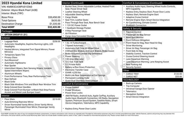Why shop with Hanna Imports? We specialize in hand-selecting top-quality used cars, trucks, and SUVs for drivers across Raleigh, Durham, Cary, Chapel Hill, and the greater Triangle area of North Carolina. Our massive selection of 1,000+ vehicles on our Raleigh lot is carefully curated to include the most sought-after models, all priced below market value. We believe in transparency and efficiency—our vehicles are aggressively priced from the start, which means no haggling, no hassle, and no wasted time. The price you see is our absolute best price. Whether you're coming from Wake Forest, Apex, Garner, or anywhere in central NC, we’re committed to making your car-buying experience smooth, affordable, and enjoyable. Come see why Hanna Imports is one of the most trusted used car dealerships in North Carolina! Used Hyundai Kona in Raleigh. Used Hyundai Kona in North Carolina, Option Group 01, Kona Limited, AWD, Apple CarPlay & Android Auto, Exterior Parking Camera Rear, Navigation System, Power moonroof, 18 x 7.5J Alloy Wheels, 3.174 Axle Ratio, 4-Wheel Disc Brakes, 8 Speakers, ABS brakes, Air Conditioning, Alloy wheels, AM/FM radio: SiriusXM, Auto High-beam Headlights, Auto-dimming Rear-View mirror, Automatic temperature control, Brake assist, Bumpers: body-color, Cargo Net, Cargo Tray, Carpeted Floor Mats, Delay-off headlights, Driver door bin, Driver vanity mirror, Dual front impact airbags, Dual front side impact airbags, Electronic Stability Control, Emergency communication system: Blue Link Connected Car Service (3-year complimentary subscription), Four wheel independent suspension, Front anti-roll bar, Front Bucket Seats, Front Center Armrest, Front reading lights, Fully automatic headlights, Garage door transmitter: HomeLink, harman/kardon® Speakers, Heated door mirrors, Heated Front Bucket Seats, Heated front seats, Illuminated entry, Leather Seat Trim, Leather Shift Knob, Leather steering wheel, Low tire pressure warning, Occupant sensing airbag, Outside temperature display, Overhead airbag, Overhead console, Panic alarm, Passenger door bin, Passenger vanity mirror, Power door mirrors, Power driver seat, Power steering, Power windows, Radio: harman/kardon Premium Audio System, Rain sensing wipers, Rear anti-roll bar, Rear seat center armrest, Rear window defroster, Rear window wiper, Remote keyless entry, Roof Rack Cross Rails (DISC), Security system, Speed control, Speed-sensing steering, Split folding rear seat, Spoiler, Steering wheel mounted audio controls, Tachometer, Telescoping steering wheel, Tilt steering wheel, Traction control, Trip computer, Turn signal indicator mirrors, and Variably intermittent wipers.