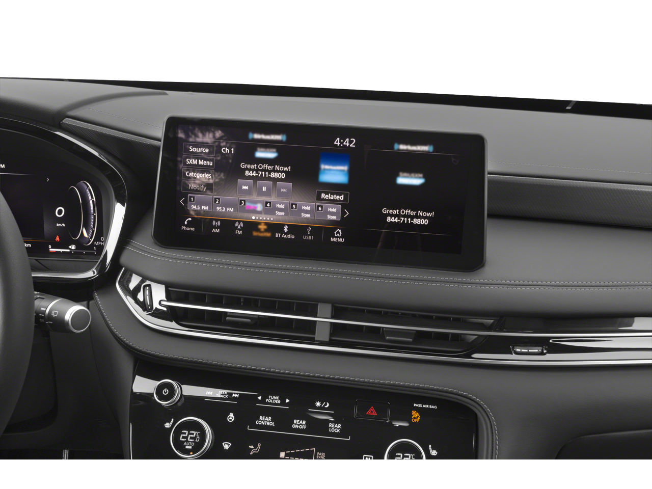 - Radio: AM/FM Audio System -inc: 9 speakers, INFINITI InTouch 12.3" interactive display w/navigation, wireless Apple CarPlay w/integration, Android Auto, Siri Eyes Free, Google Assistant, INFINITI voice recognition, Bluetooth® hands-free phone, HD Radio technology, WiFi hotspot and SiriusXM radio