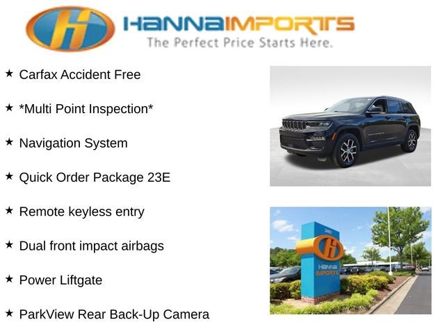 Why shop with Hanna Imports? We specialize in hand-selecting top-quality used cars, trucks, and SUVs for drivers across Raleigh, Durham, Cary, Chapel Hill, and the greater Triangle area of North Carolina. Our massive selection of 1,000+ vehicles on our Raleigh lot is carefully curated to include the most sought-after models, all priced below market value. We believe in transparency and efficiency—our vehicles are aggressively priced from the start, which means no haggling, no hassle, and no wasted time. The price you see is our absolute best price. Whether you're coming from Wake Forest, Apex, Garner, or anywhere in central NC, we’re committed to making your car-buying experience smooth, affordable, and enjoyable. Come see why Hanna Imports is one of the most trusted used car dealerships in North Carolina! Used Jeep Grand Cherokee in Raleigh. Used Jeep Grand Cherokee in North Carolina, Quick Order Package 23E, Grand Cherokee Limited, Dual front impact airbags, Heated front seats, Heated rear seats, Navigation System, ParkView Rear Back-Up Camera, Power Liftgate, Remote keyless entry, 3.45 Rear Axle Ratio, 4-Wheel Disc Brakes, 6 Speakers, ABS brakes, Active Noise Control System, Air Conditioning, Alloy wheels, AM/FM radio: SiriusXM with 360L, Anti-whiplash front head restraints, Audio memory, Auto High-beam Headlights, Automatic temperature control, Brake assist, Bumpers: body-color, Capri Leatherette Seats, Compass, Delay-off headlights, Driver door bin, Driver vanity mirror, Dual front side impact airbags, Electronic Stability Control, Emergency communication system, Four wheel independent suspension, Front anti-roll bar, Front Bucket Seats, Front Center Armrest w/Storage, Front dual zone A/C, Front fog lights, Front reading lights, Fully automatic headlights, Garage door transmitter, Heated door mirrors, Heated steering wheel, Illuminated entry, Knee airbag, Low tire pressure warning, Memory seat, Molded In Color Black/Gloss Black Roof Rails, Normal Duty Suspension, Occupant sensing airbag, Outside temperature display, Overhead airbag, Overhead console, Panic alarm, Passenger door bin, Passenger vanity mirror, Power door mirrors, Power driver seat, Power passenger seat, Power steering, Power windows, Radio data system, Radio: Uconnect 5 Nav w/10.1 Display, Rear anti-roll bar, Rear reading lights, Rear window defroster, Rear window wiper, Security system, Speed control, Speed-Sensitive Wipers, Split folding rear seat, Spoiler, Steering wheel mounted audio controls, Tachometer, Telescoping steering wheel, Tilt steering wheel, Traction control, Trip computer, Turn signal indicator mirrors, Variably intermittent wipers, Voltmeter, Wheels: 18 x 8 Fully Painted Aluminum, and Wheels: 18 x 8 Polished/Painted Aluminum.