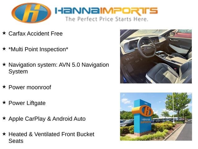 Why shop with Hanna Imports? We specialize in hand-selecting top-quality used cars, trucks, and SUVs for drivers across Raleigh, Durham, Cary, Chapel Hill, and the greater Triangle area of North Carolina. Our massive selection of 1,000+ vehicles on our Raleigh lot is carefully curated to include the most sought-after models, all priced below market value. We believe in transparency and efficiency—our vehicles are aggressively priced from the start, which means no haggling, no hassle, and no wasted time. The price you see is our absolute best price. Whether you're coming from Wake Forest, Apex, Garner, or anywhere in central NC, we’re committed to making your car-buying experience smooth, affordable, and enjoyable. Come see why Hanna Imports is one of the most trusted used car dealerships in North Carolina! Used Kia EV6 in Raleigh. Used Kia EV6 in North Carolina, EV6 GT-Line, Apple CarPlay & Android Auto, Heated & Ventilated Front Bucket Seats, Navigation system: AVN 5.0 Navigation System, Power Liftgate, Power moonroof, 14 Speakers, 4-Wheel Disc Brakes, ABS brakes, Air Conditioning, Alloy wheels, AM/FM radio: SiriusXM, Auto High-beam Headlights, Auto-dimming Rear-View mirror, Automatic temperature control, Axle Ratio: 10.650, Brake assist, Bumpers: body-color, Cargo Cover, Cargo Mat w/Luggage Board, Delay-off headlights, Driver door bin, Driver vanity mirror, Dual front impact airbags, Dual front side impact airbags, Electronic Stability Control, Emergency communication system, Floor Cargo Net, Four wheel independent suspension, Front anti-roll bar, Front Bucket Seats, Front Center Armrest, Front dual zone A/C, Front reading lights, Fully automatic headlights, Garage door transmitter: HomeLink, Heads-Up Display, Heated door mirrors, Heated front seats, Illuminated entry, Interior Lighting Kit, Knee airbag, Low tire pressure warning, Memory seat, Occupant sensing airbag, Outside temperature display, Overhead airbag, Overhead console, Panic alarm, Passenger door bin, Passenger vanity mirror, Power door mirrors, Power driver seat, Power passenger seat, Power steering, Power windows, Radio: Meridian Premium Audio System, Rain sensing wipers, Rear anti-roll bar, Rear seat center armrest, Rear window defroster, Remote keyless entry, Security system, Smart Key w/ Push Button and Remote Start, Speed control, Speed-sensing steering, Split folding rear seat, Spoiler, Sport steering wheel, Steering wheel mounted audio controls, Telescoping steering wheel, Tilt steering wheel, Traction control, Trip computer, Turn signal indicator mirrors, Variably intermittent wipers, Vegan Leather Seat Trim, Ventilated front seats, and Wheels: 7.5J x 19 Black Painted Alloy.
