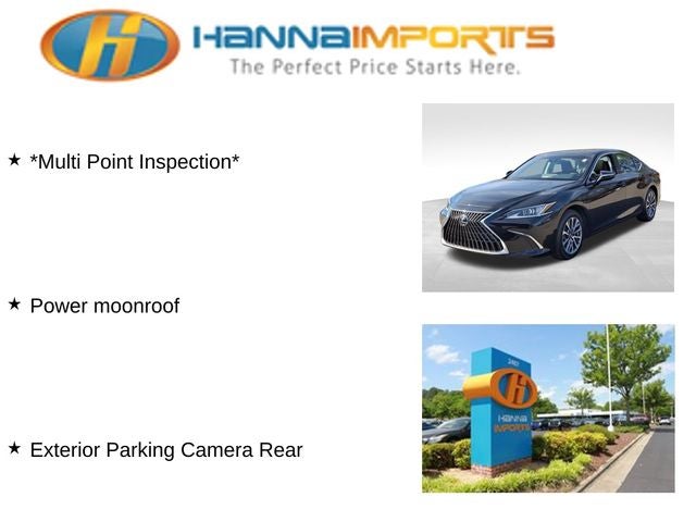 Why shop with Hanna Imports? We specialize in hand-selecting top-quality used cars, trucks, and SUVs for drivers across Raleigh, Durham, Cary, Chapel Hill, and the greater Triangle area of North Carolina. Our massive selection of 1,000+ vehicles on our Raleigh lot is carefully curated to include the most sought-after models, all priced below market value. We believe in transparency and efficiency—our vehicles are aggressively priced from the start, which means no haggling, no hassle, and no wasted time. The price you see is our absolute best price. Whether you're coming from Wake Forest, Apex, Garner, or anywhere in central NC, we’re committed to making your car-buying experience smooth, affordable, and enjoyable. Come see why Hanna Imports is one of the most trusted used car dealerships in North Carolina! Used Lexus ES in Raleigh. Used Lexus ES in North Carolina, Black w/Black Open Pore w/Semi-Aniline Leather Seat Trim, Exterior Parking Camera Rear, Power moonroof, 10 Speakers, 10-Way Power Adjustable Front Seats, 4-Wheel Disc Brakes, ABS brakes, Air Conditioning, Alloy wheels, AM/FM radio: SiriusXM, Auto High-beam Headlights, Auto-dimming door mirrors, Auto-dimming Rear-View mirror, Automatic temperature control, Brake assist, Bumpers: body-color, Compass, Delay-off headlights, Driver door bin, Driver vanity mirror, Dual front impact airbags, Dual front side impact airbags, Electronic Stability Control, Emergency communication system, Four wheel independent suspension, Front anti-roll bar, Front Bucket Seats, Front Center Armrest, Front dual zone A/C, Front reading lights, Fully automatic headlights, Garage door transmitter: HomeLink, Heated door mirrors, Illuminated entry, Knee airbag, Leather Shift Knob, Leather steering wheel, Low tire pressure warning, Occupant sensing airbag, Outside temperature display, Overhead airbag, Overhead console, Panic alarm, Passenger door bin, Passenger vanity mirror, Perforated NuLuxe Seat Trim, Power door mirrors, Power driver seat, Power passenger seat, Power steering, Power windows, Radio data system, Radio: Lexus Interface w/8 Multimedia Touch Scrn, Rear anti-roll bar, Rear reading lights, Rear seat center armrest, Rear side impact airbag, Rear window defroster, Remote keyless entry, Security system, Speed control, Speed-sensing steering, Steering wheel mounted audio controls, Tachometer, Telescoping steering wheel, Tilt steering wheel, Traction control, Trip computer, Turn signal indicator mirrors, Variably intermittent wipers, Wheels: 17 x 7.5J Twin-V-Spoke Alloy, and Wireless Apple CarPlay/Wireless Android Auto.