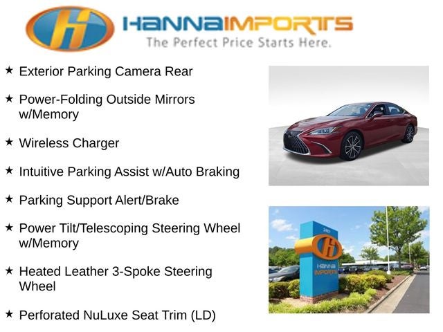 Why shop with Hanna Imports? We specialize in hand-selecting top-quality used cars, trucks, and SUVs for drivers across Raleigh, Durham, Cary, Chapel Hill, and the greater Triangle area of North Carolina. Our massive selection of 1,000+ vehicles on our Raleigh lot is carefully curated to include the most sought-after models, all priced below market value. We believe in transparency and efficiency—our vehicles are aggressively priced from the start, which means no haggling, no hassle, and no wasted time. The price you see is our absolute best price. Whether you're coming from Wake Forest, Apex, Garner, or anywhere in central NC, we’re committed to making your car-buying experience smooth, affordable, and enjoyable. Come see why Hanna Imports is one of the most trusted used car dealerships in North Carolina! Used Lexus ES in Raleigh. Used Lexus ES in North Carolina, Premium Package (Heated & Ventilated Seats, Heated Leather 3-Spoke Steering Wheel, Intuitive Parking Assist w/Auto Braking, Parking Support Alert/Brake, Perforated NuLuxe Seat Trim (LD), Power Tilt/Telescoping Steering Wheel w/Memory, Power-Folding Outside Mirrors w/Memory, Rain Sensing Wipers, Windshield De-Icer, and Wireless Charger), Acorn w/Black Open Pore w/Semi-Aniline Leather Seat Trim, Exterior Parking Camera Rear, Power moonroof, 10 Speakers, 10-Way Power Adjustable Front Seats, 4-Wheel Disc Brakes, ABS brakes, Air Conditioning, Alloy wheels, AM/FM radio: SiriusXM, Auto High-beam Headlights, Auto-dimming door mirrors, Auto-dimming Rear-View mirror, Automatic temperature control, Brake assist, Bumpers: body-color, Compass, Delay-off headlights, Driver door bin, Driver vanity mirror, Dual front impact airbags, Dual front side impact airbags, Electronic Stability Control, Emergency communication system, Four wheel independent suspension, Front anti-roll bar, Front Bucket Seats, Front Center Armrest, Front dual zone A/C, Front reading lights, Fully automatic headlights, Garage door transmitter: HomeLink, Heated door mirrors, Illuminated entry, Knee airbag, Leather Shift Knob, Leather steering wheel, Low tire pressure warning, Occupant sensing airbag, Outside temperature display, Overhead airbag, Overhead console, Panic alarm, Passenger door bin, Passenger vanity mirror, Perforated NuLuxe Seat Trim, Power door mirrors, Power driver seat, Power passenger seat, Power Rear Sunshade, Power steering, Power windows, Radio data system, Radio: Lexus Interface w/8 Multimedia Touch Scrn, Rear anti-roll bar, Rear reading lights, Rear seat center armrest, Rear side impact airbag, Rear window defroster, Remote keyless entry, Security system, Speed control, Speed-sensing steering, Steering wheel mounted audio controls, Tachometer, Telescoping steering wheel, Tilt steering wheel, Traction control, Trip computer, Turn signal indicator mirrors, Variably intermittent wipers, Wheels: 17 x 7.5J Twin-V-Spoke Alloy, Wireless Apple CarPlay/Wireless Android Auto, and Wood Trim w/Ambient Lighting.